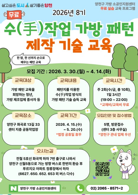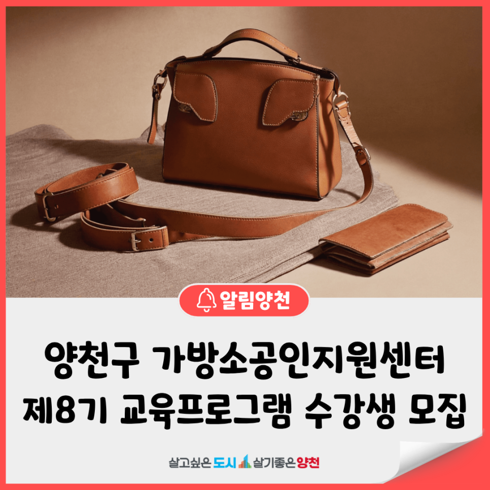 이미지를 누르면 사진이 크게 보여요! 내 손으로 만드는 가방의 기초부터 실전까지! 2026년 양천구 가방 소공인지원센터 제8기 교육생 모집 평소 가방 제작에 관심이 있었거나, 직무 역량을 키우고 싶은 종사자분들을 위해 양천구에서 무료 전문 교육을 준비했습니다. 패턴 제작과 봉제 실습, 두 가지 과정 중 나에게 맞는 수업을 선택해 보세요! 가방 봉제 실습 전문가 과정...