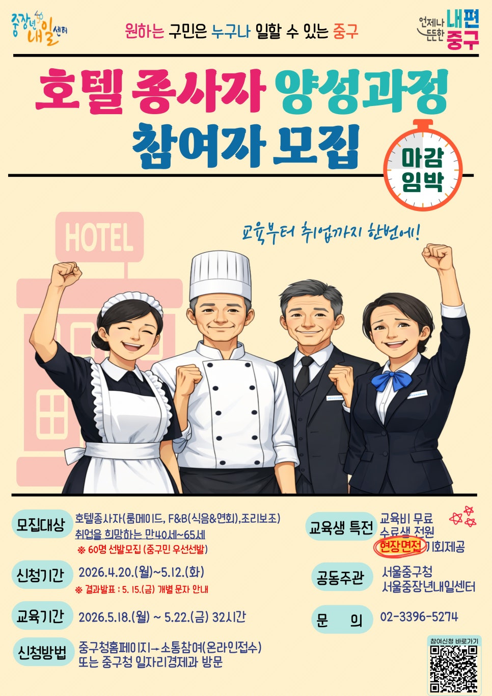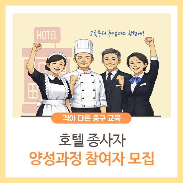 호텔 취업을 준비 중이라면 주목!✨ 교육부터 취업까지 한 번에 연결되는 기회가 중구에서 열립니다 🙌 호텔 분야 취업을 희망하는 분들을 위한「호텔 종사자 양성과정」 참여자를 모집합니다! 실무 중심 교육은 물론, 수료 후 현장면접 기회까지 제공되니 취업을 준비 중이라면 놓치지 마세요 😊 📌 어떤 과정인가요? 이번 과정은 호텔 현장에서 바로 활용 가능한 직무 중심 교육으로...