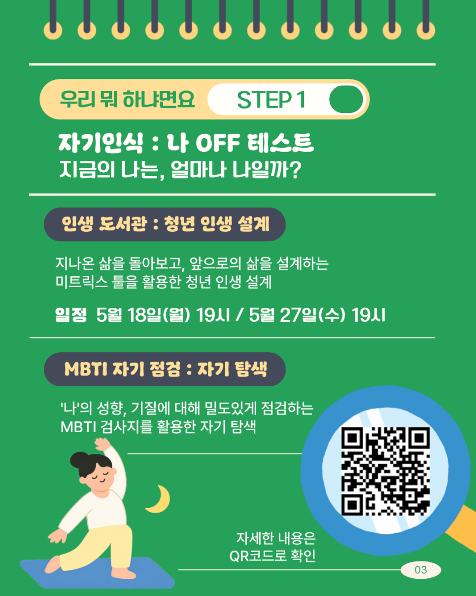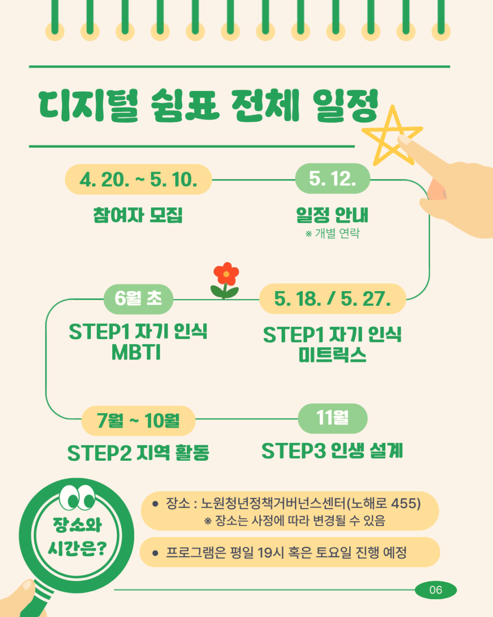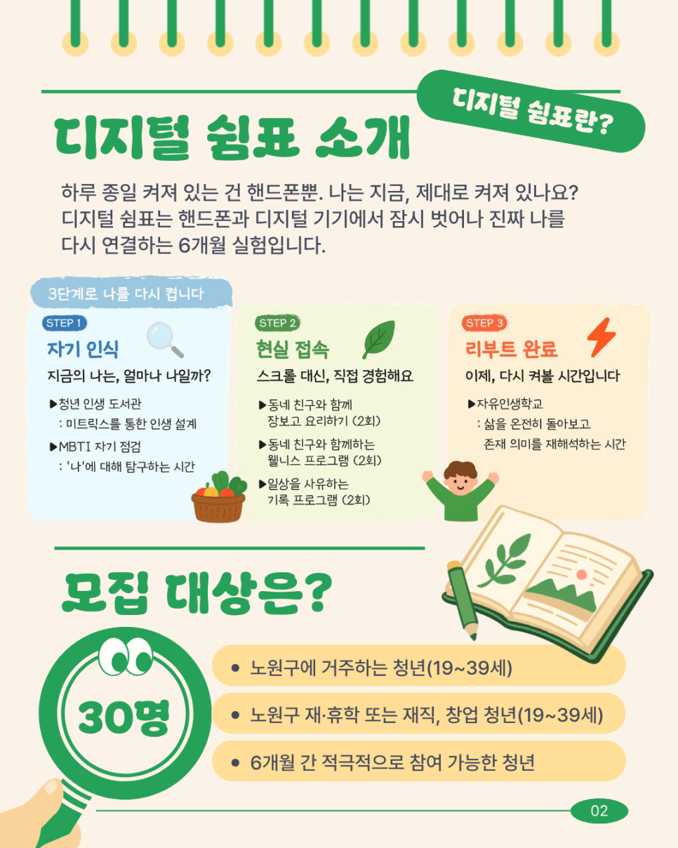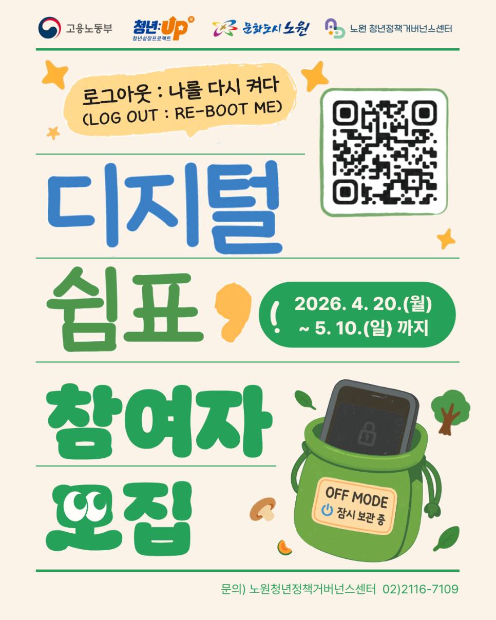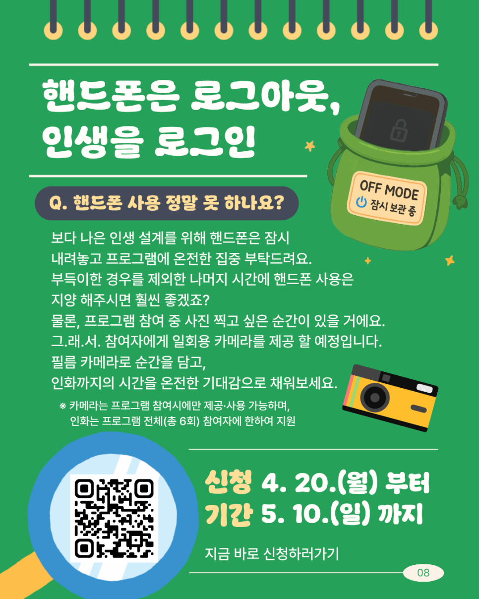 🎧로그아웃: 나를 다시 켜다 (LOG OUT : RE-BOOT ME) 디지털 쉼표 프로그램 참여자 모집 "핸드폰은 로그아웃, 인생을 로그인" 하루 종일 켜져 있는 건 핸드폰뿐. 나는 지금, 제대로 켜져 있나요? 디지털 쉼표는 핸드폰에서 잠시 벗어나 진짜 나를 다시 연결하는 6개월 실험입니다. 🙋이런 게 하고 싶었던 사람 ✔ 나를 제대로 알아보는 시간 ✔ 핸드폰 없이 살...