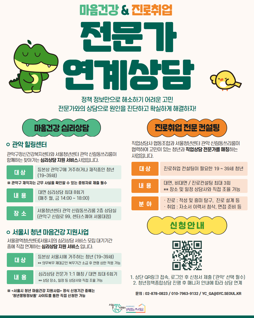 안녕하세요, 서울청년센터 관악 신림동쓰리룸입니다 :) 진로와 이직 문제, 마음건강 문제의 해소 등... 혼자서 해결하기에 어렵고 복잡한 문제들, 이제는 서울청년센터 관악 신림동쓰리룸 청년정책종합상담의 「전문 컨설팅 연계」 를 통해 해소해보세요! 「전문 컨설팅 연계」는 청년시민분들의 말하기 어려웠던 힘든 고민을 각 분아의 수준 높은 전문가들과 함께 논의할 수 있는 프로그램입니다 :) [ 개 요 ] ㆍ참여자 특성에 맞춘 마음건강/진로취업 주제의 전문가 상담 서비스 ㆍ6~8회의 전문 심리상담, 3회의 진로취업 전문 컨설팅 연계 [ 참여 방법 ] ㆍ↓아래 링크↓에 접속해 청년정책종합상담 신청하기 ※ 꼭! 관악의 상담을 신청해주세요 링크 : https://youth.seoul.go.kr/crm/front/index.do ㆍ청년지원매니저와 상담 진행 ㆍ상담을 통해 연계가 필요한 컨설팅 서비스 확정 ㆍ상담을 통해 정책 정보도 챙기고 전문 컨설팅 연계받기 :) [ 컨설팅 서비스 상세 ] ㆍ(마음건강) 관악 힐링센터 - 관악구정신건강복지센터 상담사가 청년센터로 찾아오는 심리상담 서비스 - 대상 : 등본상 관악구에 거주하거나 재직 중인 청년 (19~39세) ** 관악구 재직자는 근무 사실 확인용 증빙자료 제출 필수 - 내용 : 대면 심리상담 최대 8회기 (매주 월, 금 14:00~18:00) - 장소 : 서울청년센터 관악 신림동쓰리룸 2층 상담실 (관악구 신림로 99, 센터스퀘어 서울대점 청년활력공간 2층) ㆍ(마음건강) 서울시 청년 마음건강 지원사업 - <서울시 청년 마음건강 지원사업> 정식 신청기간을 놓친 청년을 대상으로 하는 심리상담 연계 서비스 - 대상 : 등본상 서울시에 거주하는 청년 (19~39세) ** 의무복무 제대군인 복무기간 소급 후 연령 상한 적용 가능 - 내용 : 대면 심리상담 최대 6회기 (심리상담 전문가 1:1 매칭 서비스 연계) ** 구체적인 사업 정보는 <서울시 청년 마음건강 지원사업> 참고 ** <서울시 청년 마음건강 지원사업> 정식 신청기간에는 '청년몽땅정보통' 사이트를 통한 직접 신청만 가능 ㆍ(진로취업) 일대일 진로취업 전문 컨설팅 - 대상 : 진로취업 전문 컨설팅이 필요한 19~39세 청년 - 내용 : 대면, 비대면 1:1 진로컨설팅 최대 3회 진행 - 분야 상세 ㆍ적성 및 흥미 탐구 / 진로 설계 ㆍ각종 직업 관련 정보 탐색 ㆍ구직 관련 서류(자기소개서, 이력서, 포트폴리오 등) 첨삭 지도 ㆍ면접 컨설팅 및 코칭 지도 [ 기 간 ] ㆍ~ 2026. 11. 30. (월) [ 문 의 ] ㆍyc_ga@syc.seoul.kr / 02-878-0823 / 010-7963-9132