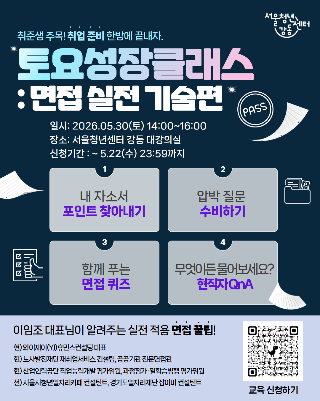 서울청년센터 강동 <5월 토요 성장 클래스 : 면접 실전 기술 (현직자 특강)> 참여자 모집 🌞 취업·이직 준비생 주목!!🌞 "AI가 써준 내 자소서... 면접에서 털리면 어떡하지? 😱" "압박 질문만 받으면 머릿속이 하얘져요." "내 자소서에서 어떤 질문이 나올지 미리 알고 싶어요." 서류 합격의 기쁨도 잠시, 면접관의 날카로운 질문 공세 가 두려운 여러분을 위해 준비했습니다. ✨ 이번 특강에서 얻어갈 핵심 포인트: 자소서 셀프 진단: 내 자소서의 약점과 강점 파악하기 압박 질문 수비: 면접관의 의도를 파악하고 유연하게 대처하기 면접 준비를 위한 Q&A "어떻게 말해야 할지" 고민하지 마세요. "무엇을 질문할지" 예측하는 기술을 배우면 면접이 쉬워집니다. 막막했던 물음표(?)를 시원한 느낌표(!)로 바꿀 기회, 5월 현직자 특강에서 만나요! 👋 🙋♀️ 1. 이런 청년을 찾습니다! (필수) 4/30 공고일 기준, 만 19세~39세 청년 ※연령연장: 의무복무 제대군인은 복무기간에 비례하여 최대 3세까지 상한 연장 적용 - AI로 다듬은 자소서를 바탕으로 실전 면접 대응력을 키우고 싶은 분 - 면접관의 날카로운 꼬리 질문과 압박 질문이 두려운 취업준비생 - 면접 답변을 통째로 외우다가 망쳐본 경험이 있는 분 - 자신의 경험을 '직무 언어'로 바꾸기 어려운 분 ⏰ 2. 프로그램 일정 및 진행 내용 🗓️ 진행 일정 및 준비물 - 2026. 05. 30. (토) 14:00 ~ 16:00 - 장소: 서울청년센터 강동 대강의실 - 준비물: 이력서, 자기소개서, 필기도구 📚 진행 내용 1) 내 자소서 포인트 찾아내기 (셀프 진단) - 면접관의 눈으로 본 '묻기 좋은' 키워드 3가지 추출 - AI가 쓴 문장을 '내 경험의 언어'로 바꾸는 법 2) 압박 질문 수비하기 : 함께 푸는 면접 퀴즈 - 3단계 답변 구조화 공식 학습 - 대표적인 자소서 유형 케이스 스터디 3) 무엇이든 물어보세요 - 현직자에게 묻는 "이럴 땐 어떻게 답해요?" 3. 신청방법 : 이미지 내 QR코드 스캔 또는 하단의 구글폼 링크 접수! https://forms.gle/HThsPJYPZFmMcLBh9 📆신청 기간 : 4/30(목) ~ 5/20(수) 23:59까지 🔔참여자 선정 : 5/21(목) 오후 중 선정자에 한해 문자 연락 드립니다. (▶전화 : 02-441-9380~3) (▶문자 : 010번호로 문자 연락) 💥미선정자에게는 별도로 안내해 드리지 않습니다. 💥선정자의 경우, 문자로 안내해 드리는 "프로그램 사전조사"를 응답해 주셔야 최종 참여자로 확정됩니다.