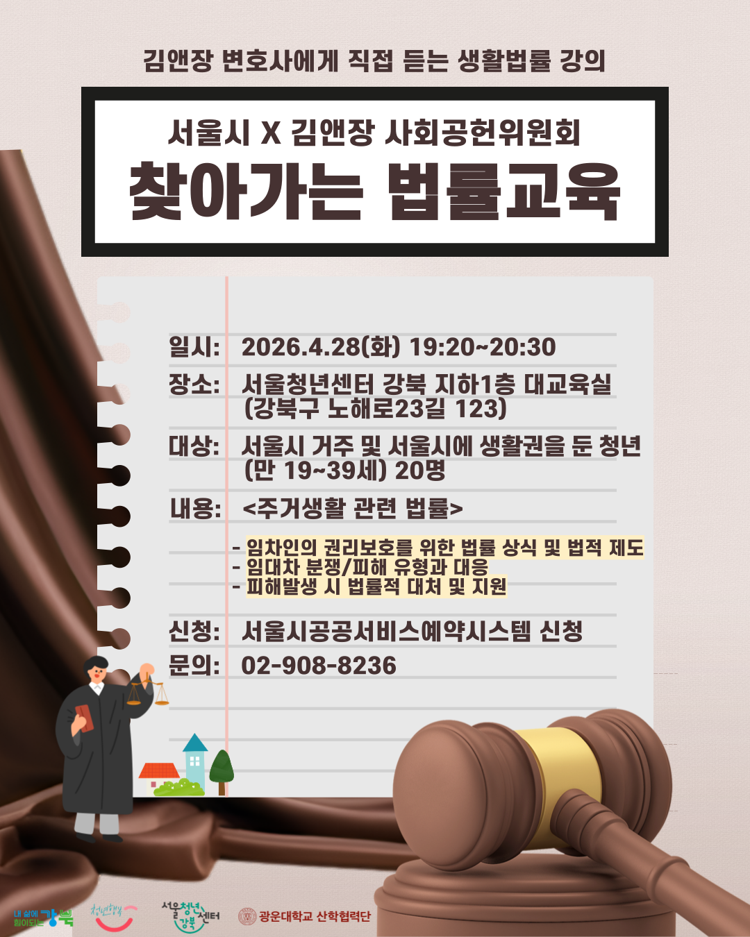 김앤장 변호사에게 직접 듣는 생활법률 강의 '서울시 X 김앤장 사회공헌위원회 '찾아가는 법률교육' 전세·월세 계약, 아직도 불안하신가요? 😥 임차인이라면 꼭 알아야 할 권리와 대응 방법, 이번 기회에 제대로 배워보세요! 🏠📚 📌 일시: 2026.4.28(화) 19:20~20:30 📌 장소: 서울청년센터 강북 지하 1층 대교육실 (서울특별시 강북구 노해로23길 123, 강북청년창업마루) 📌 대상: 서울시 거주 또는 생활권 청년(만 19~39세) 20명 * 제대군인은 복무기간에 따라 최대 3년 연령 상한 연장 📌 주요 내용 ✔ 전세보증보험, 확정일자, 등기부등본 보는 법 🔍 ✔ 임대차 계약 시 필수 체크사항 ✍️ ✔ 전세사기 및 분쟁 유형과 대응 방법 🚨 ✔ 피해 발생 시 법적 대응 및 지원 안내 ⚖️ 📌 신청: 서울시 공공서비스예약 시스템 신청 * 사전 질문이 있을 시, 작성해주세요. * 사전 질문을 최대한 반영하고자 하나 상황에 따라 교육생의 사전 질문이 포함되지 않을 수 있습니다. 📌 주의사항 * 기관 사정에 따라 내용은 변경될 수 있습니다. * 교육시 촬영 및 녹음 금지됩니다. * 본 교육은 법률지식 교육입니다. 현장질문은 개인상담이 아닌 교육 시 궁금했던 법률지식만 질문해주세요. 📞 문의: 02-908-8236 💡 “알면 지키고, 모르면 당합니다!” 내 보증금 지키는 첫 걸음, 지금 신청하세요 🙌