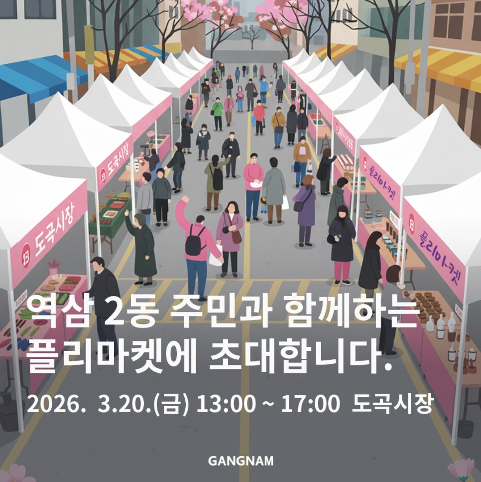 따뜻한 봄날, 나눔과 즐거움이 함께하는 특별한 플리마켓이 열립니다. 주민과 상인이 함께 만드는 의미 있는 행사, 역삼2동 플리마켓이 오는 3월 20일, 도곡시장에서 개최됩니다. 단순한 장터를 넘어 플리마켓, ESG 체험, 문화공연까지 어우러진 자원순환과 지역공동체의 가치를 경험할 수 있는 자리입니다. 일 시: 2026. 3. 20.(금) 13:00 ~ 17:00 (개막식 1...