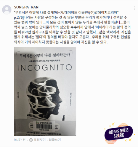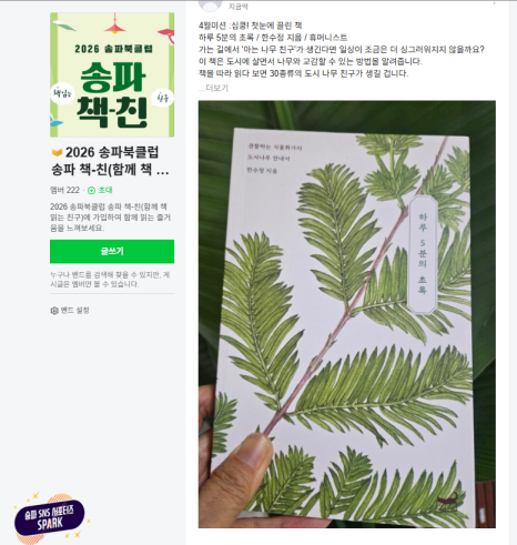 글·사진: 블로그 크리에이터 김영문 "야 너두? 나두!" 같이 읽으면 3배 더 맛있는 독서 맛집, '책-친'이 떴습니다! 안녕하세요, 송파구민 여러분! 혹시 침대 머리맡에 읽다 만 책들이 탑처럼 쌓여있진 않으신지요? "올해는 꼭 매월 한 권이라도 읽자!" 굳게 다짐했지만, OTT 서비스의 유혹 앞에 무릎 꿇은 적은요? 그 마음, 송파구도 100% 했나 봅니다. 혼자 ...