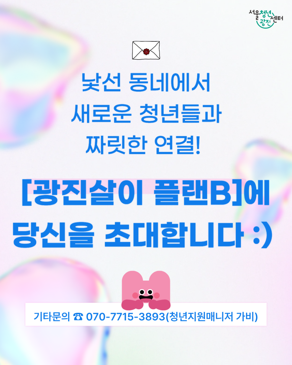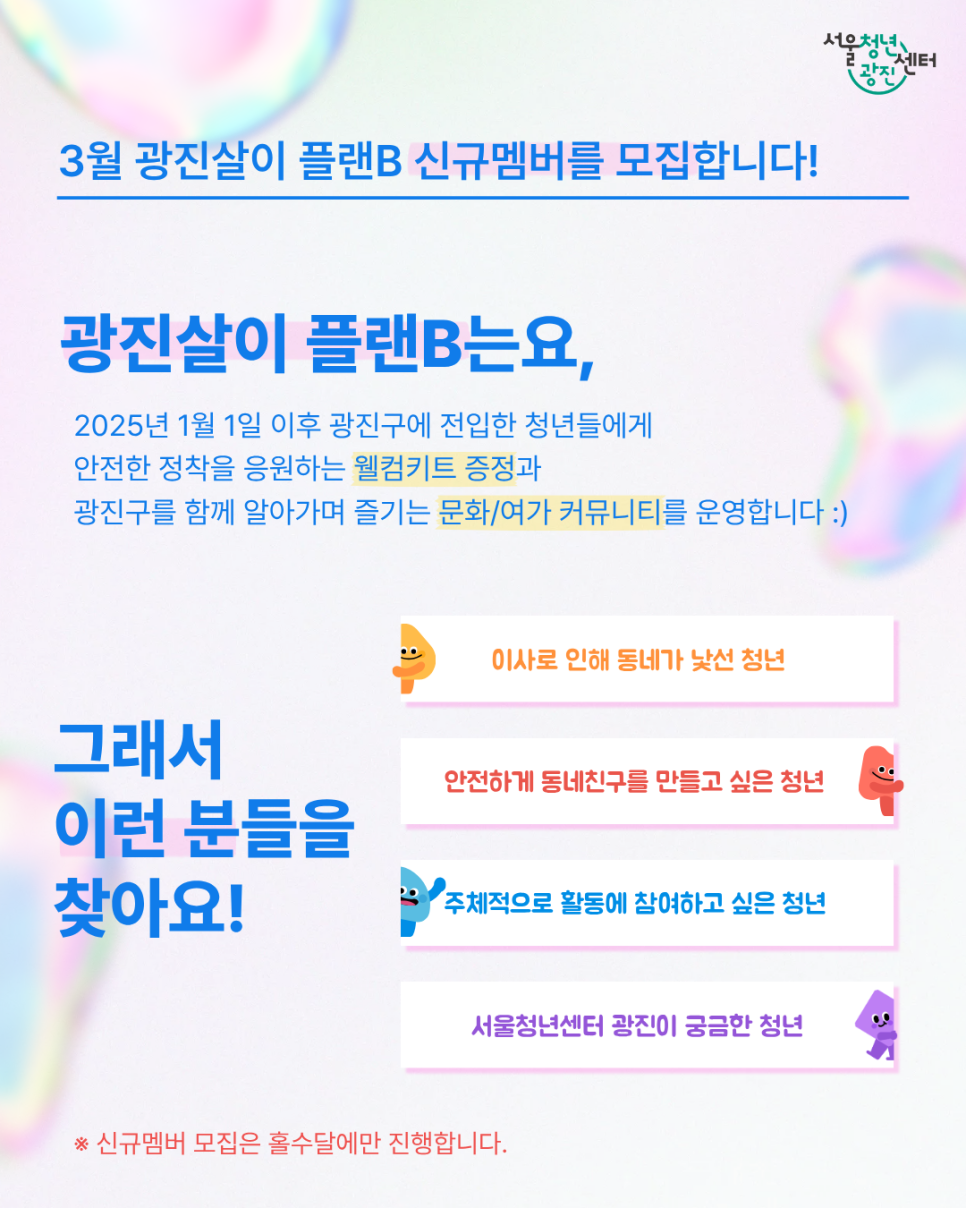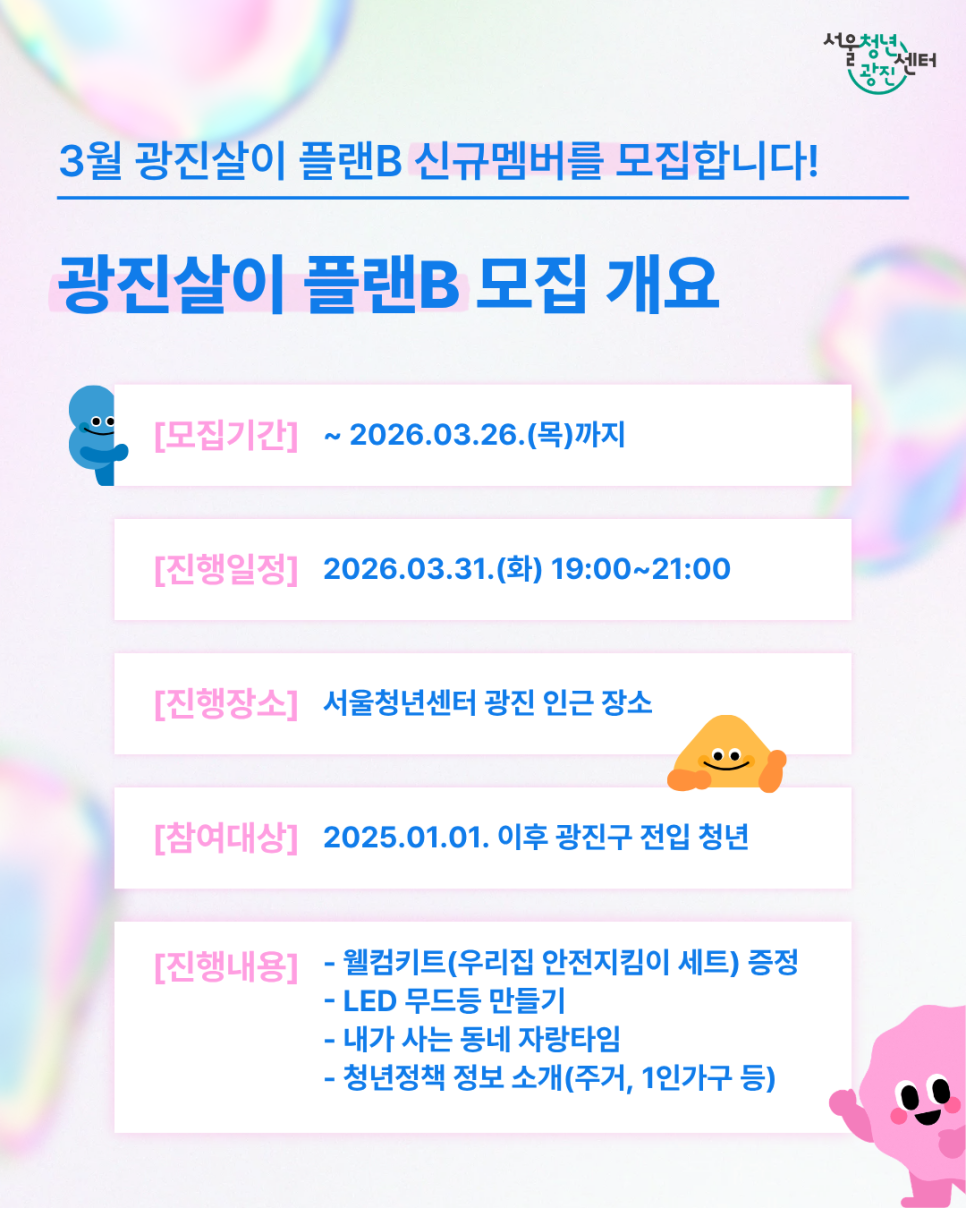 서울청년센터 광진 <2026년 3월 광진살이 플랜B> 신규멤버 모집 광진살이 플랜B는요, 2025년 1월 1일 이후 광진구로 전입한 청년들에게 안전한 정착을 응원하는 🎁 웰컴키트 🎁 증정과 광진구를 함께 알아가며 즐기는 🎈 문화/여가 커뮤니티 ✨ 를 운영합니다! 😶 이사로 인해 동네가 낯선 청년, 😉 1인 가구이거나 다인가구 인 청년, 🤩 안전하게 동네친구를 만들고 싶은 청년, 🤗 주체적으로 활동에 참여하고 싶은 청년, 🤓 서울청년센터 광진이 궁금한 청년, 모두모두 환영합니다 :) ※ 신규 멤버 모집은 홀수달에만 진행합니다. [모집 개요] 💐 모집기간: ~03.26.(목)까지 💐 진행일정: 2026.03.31.(화) 19:00~21:00 💐 진행장소: 서울청년센터 광진 인근 장소 ※ 선정자에 한해 개별 안내 💐 참여대상: 2025.01.01. 이후 광진구 전입한 만 19~39세 청년 10명 ※ 1인가구, 다인가구 모두 참여 가능 ※ 의무복무를 마친 제대군인의 경우 연령 기준 연장(1~2년)하여 참여 가능 ※ 2배수 이상 모집 시 조기마감될 수 있음 💐 진행내용 1️⃣ 웰컴키트(우리집 안전지킴이 세트) 증정 2️⃣ 우리집 무드잡는 LED 무드등 만들기 3️⃣ 내가 사는 동네 자랑타임 4️⃣ 청년정책 정보 소개(주거, 1인가구 등) 💐 선정발표: 2026.03.27.(금) 개별 문자 안내 💐 신청링크: https://bi t.ly/플랜비3월 💐 기타문의: 070-7715-3893(청년지원매니저 가비)