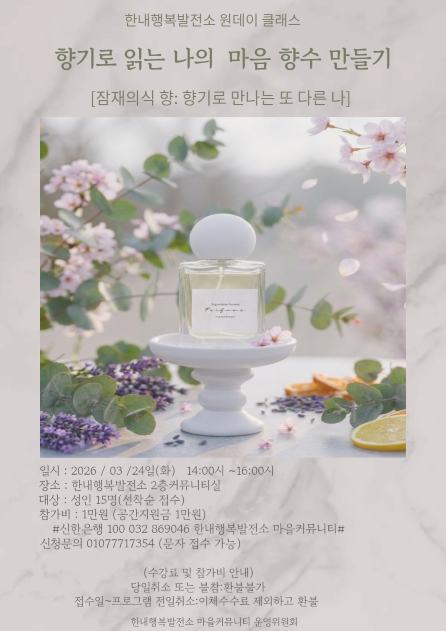 한내행복발전소 <향기로 읽는 나의 마음 향수 만들기> 잠재의식 향 : 향기로 만나는 또 다른 나 향기로 만나는 또 다른 나를 찾는 시간, 한내행복발전소에서 함께 만들고 싶은 분들은 바로 접수해주세요. 신청기간 : 3/17 ~ 3/23 (16시까지) 진행일시 : 3/24(화) 14시 ~ 16시 장소 : 한내행복발전소 2층 커뮤니티실 대상 : 성인 15명(선착순 마감) 참가비 : 1만원 신청문의 : 010-7771-7354 [수강료 및 참가비 안내] * 당일취소나 불참은 환불 불가 접수일~프로그램 전일 취소는 이체수수료 제외하고 환불