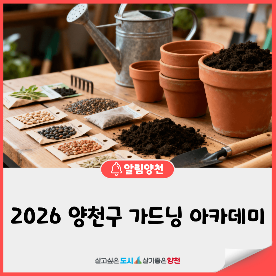 지구를 살리고 나를 치유하는 시간, 식물과 사람이 공존하는 2026 양천구 가드닝 아카데미에 여러분을 초대합니다. 2026년 양천구 가드닝 아카데미는 정원과 식물에 대해 전문적으로 배울 수 있는 시민 대상 공개강의입니다. 2026 양천구 가드닝 아카데미 일정 📅 분류 | 일 정 | 주 제 | 모집일자 Par1. 지구를 돌보는 정원 | 4.28.(화) | 지구를 돌보는 오가닉 정원 | 4.1.(수)~ 4.26...