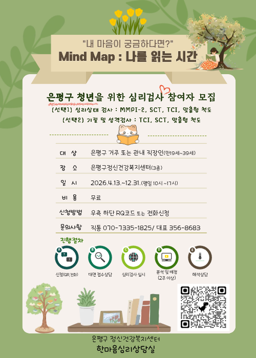 은평구정신건강복지센터에서 은평구 청년들을 위한 심리검사 『Mind Map : 나를 읽는 시간』 을 진행합니다! 🧠 내 마음이 궁금한 요즘, 전문 상담사와 함께 나를 이해해보는 시간 가져보세요. 심리검사부터 해석 상담까지 무료로 지원되는 프로그램입니다 🙂 🧑 대상 은평구 거주 또는 관내 직장인 (만 19세 ~ 39세) 📅 기간 2026. 4. 13. ~ 12. 31. ⏰ 운영시간 10:00 ~ 17:00 📍 장소 은평구정신건강복지센터 (불광보건지소 3층) 💰 비용 무료 🧩 이렇게 진행돼요 - 온라인 또는 전화 접수 - 일정 조율 후 센터 방문 상담 - 개별 맞춤형 심리검사 진행 - 검사 분석 (약 2주 소요) - 전문 상담사와 해석 상담 (약 50분) - 필요 시 심리지원 서비스 연계 ※ 신청 후 일정 안내를 위해 연락드리니, 전화 응답 부탁드립니다. 🧪 심리검사 안내 선택 1. 심리상태 검사 (MMPI-2, TCI 등 / 약 2시간 이상) 선택 2. 기질·성격 검사 (TCI 등 / 약 1시간 이상) ※ 우울, 불안, 스트레스, 자아존중감 등 다양한 영역을 함께 확인할 수 있습니다. 👇 신청 바로가기 https://docs.google.com/forms/d/17T3NCxrkz-3EgEd7rrW5VMOdGrqWEC7HsoQSxnNQueU/viewform?edit_requested=true ✔ 문의 (직통) 070-7335-1825 (대표) 02-356-8683 홈페이지 https://epmind.or.kr/kor/main/
