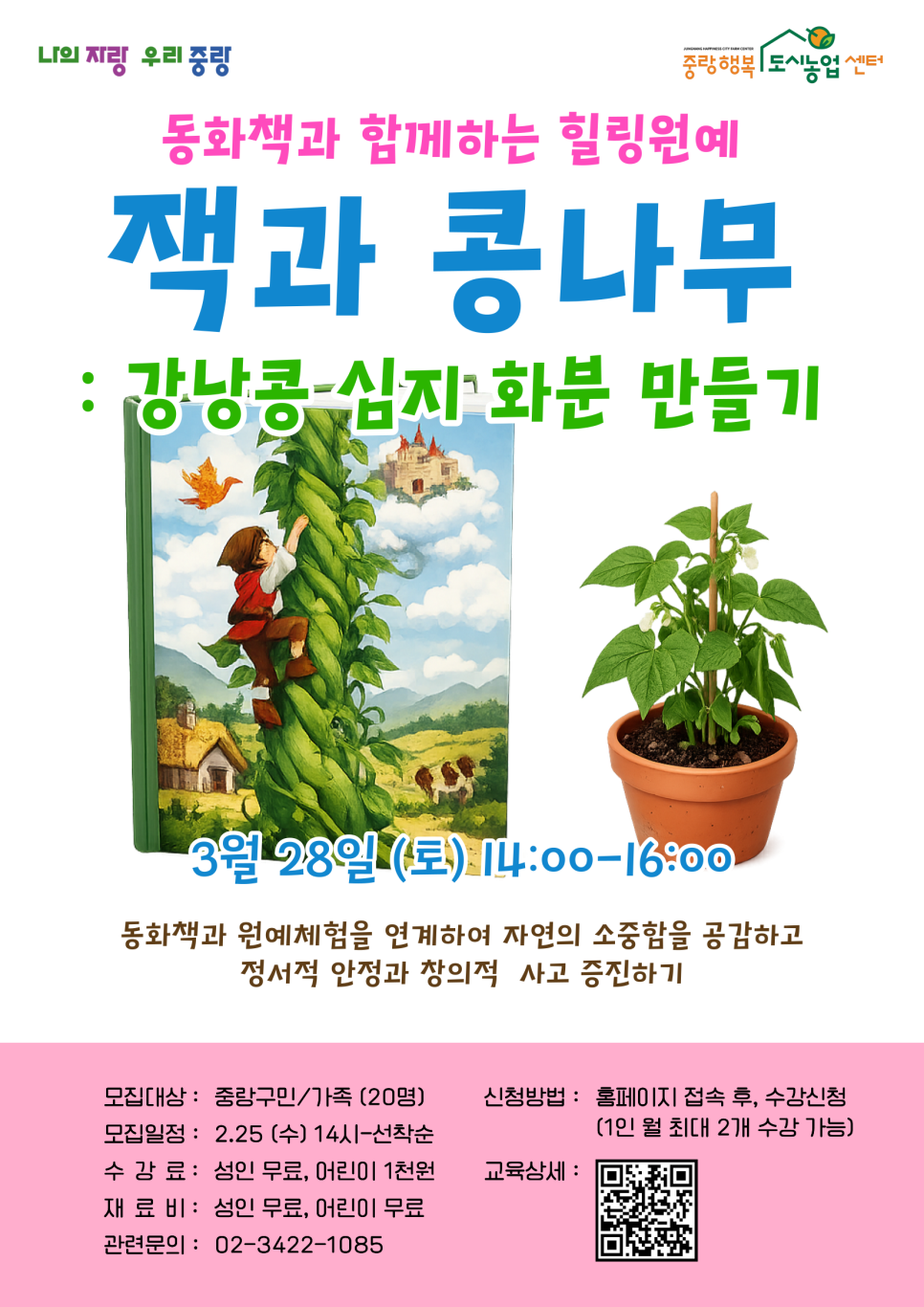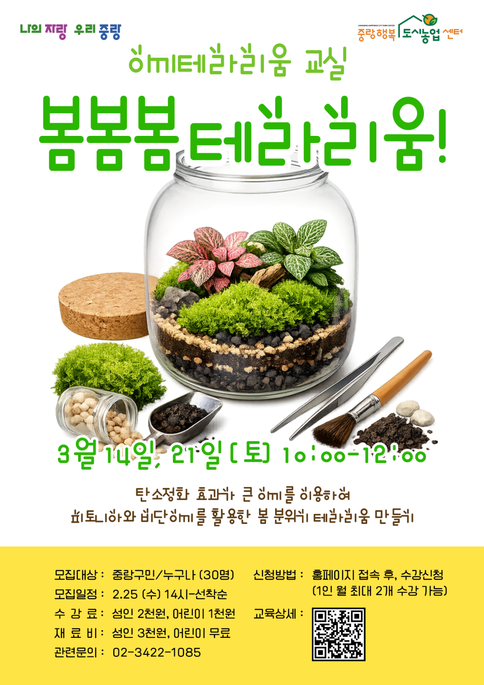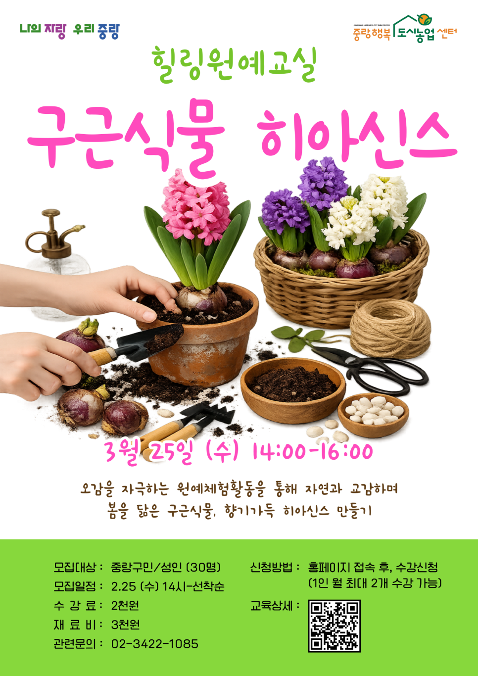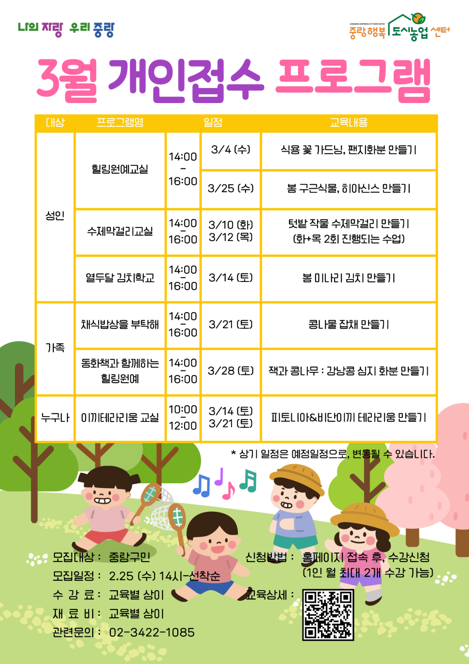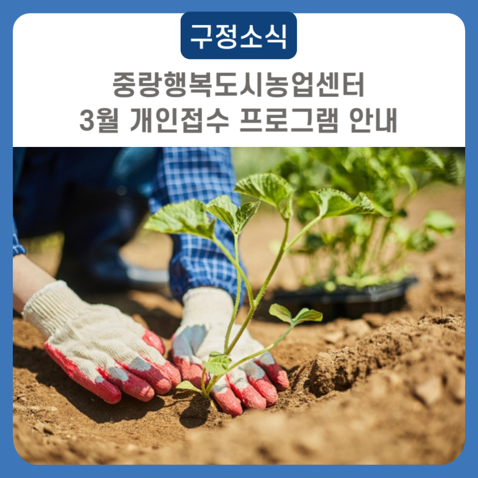 [구정소식] 중랑행복도시농업센터 3월 개인접수 프로그램 안내 문의 : 중랑행복도시농업센터(☎ 02-2094-1085) 중랑구민 여러분의 건강한 체험과 행복한 여유를 위한 중랑행복도시농업센터 3월 개인접수 프로그램을 안내드립니다. 힐링원예교실, 수제막걸리교실, 열두달 김치학교, 채식밥상, 이끼테라리움 교실 등 다양한 프로그램을 만나보세요~ 3월 개인접수 프로그램은 2월 25일(...)