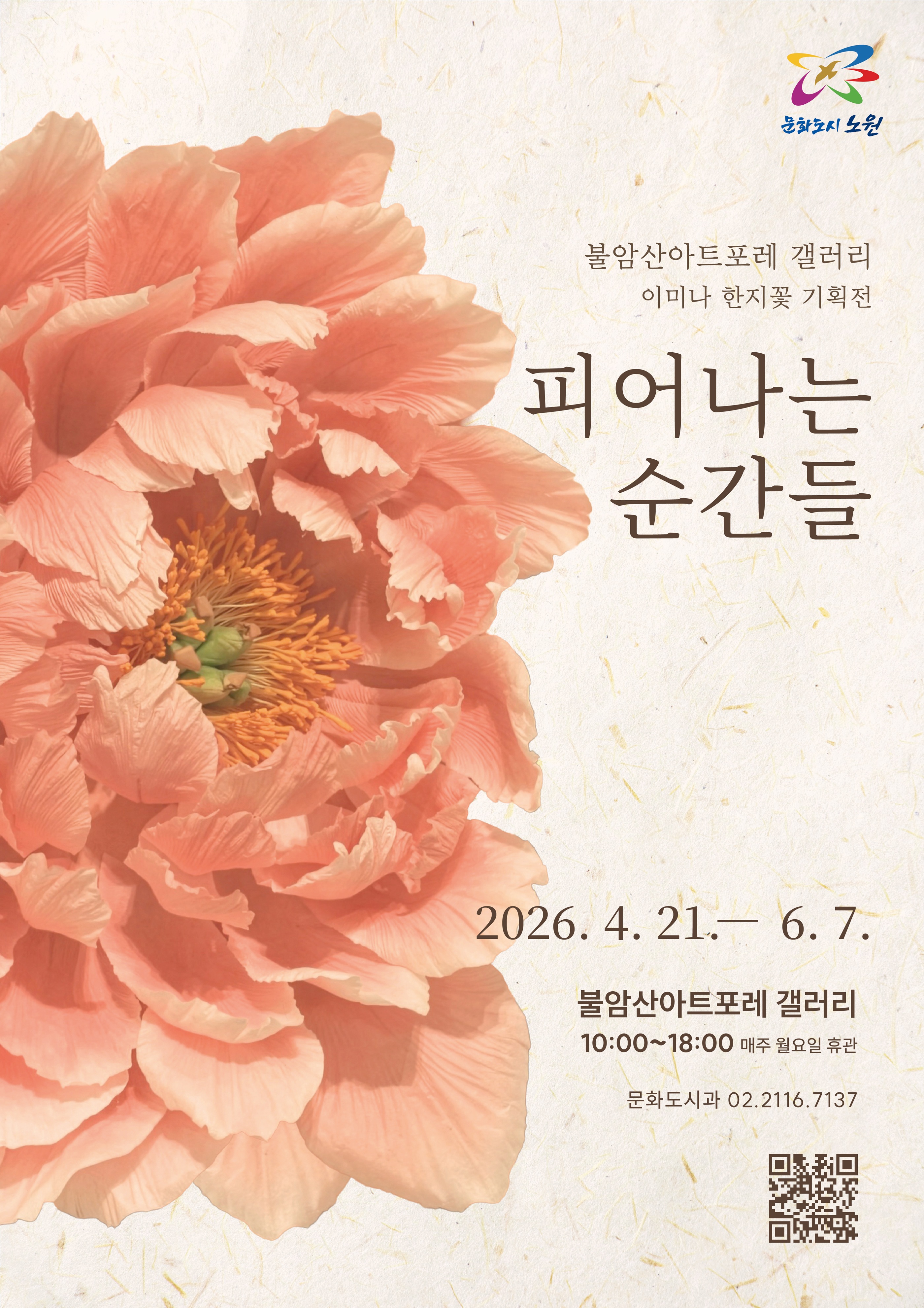 불암산아트포레 갤러리 <한지꽃 기획전 「피어나는 순간들」전시 개최> 한지로 피워낸 한지꽃 공예 「피어나는 순간들」 전시를 개최합니다. 꽃이 피어나고 만개하는 찰나의 감동을 한지 공예로 표현합니다 처음 봉오리가 맺히는 순간 서서히 꽃잎이 열리는 순간 마침내 화려하게 만개하기까지 시간의 흐름에 따른 꽃의 아름다운 시간들을 한지 특유의 따뜻한 질감과 섬세한 손길로 담아냅니다. 한지로 피워낸 꽃이 전하는 피어나는 순간순간의 아름다움을 함께 느껴보세요:) ★ 전시 개요 - 전시기간 : 2026. 4. 21.(화) ~ 2026. 6. 7.(일) - 운영시간 : 10:00 ~ 18:00, 매주 월요일 휴관 - 전시장소 : 불암산아트포레 갤러리(불암산힐링타운 내) - 전시내용 : 전통 소재 한지로 꽃이 피어나는 순간을 담아내, 꽃의 생명력과 아름다움을 표현한 작품 20여 점. 2026년 철쭉제 기간중 4월18일(토)/ 4월19일(일) / 4월25일(토)/ 4월26일(일)에는 "한지꽃 머리핀 만들기" 특별 프로그램이 운영됩니다. ★장소 : 불암산아트포레 갤러리 앞 ★시간 : 10:00 ~17:00