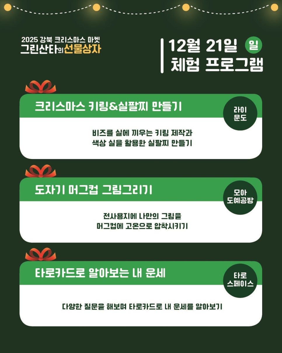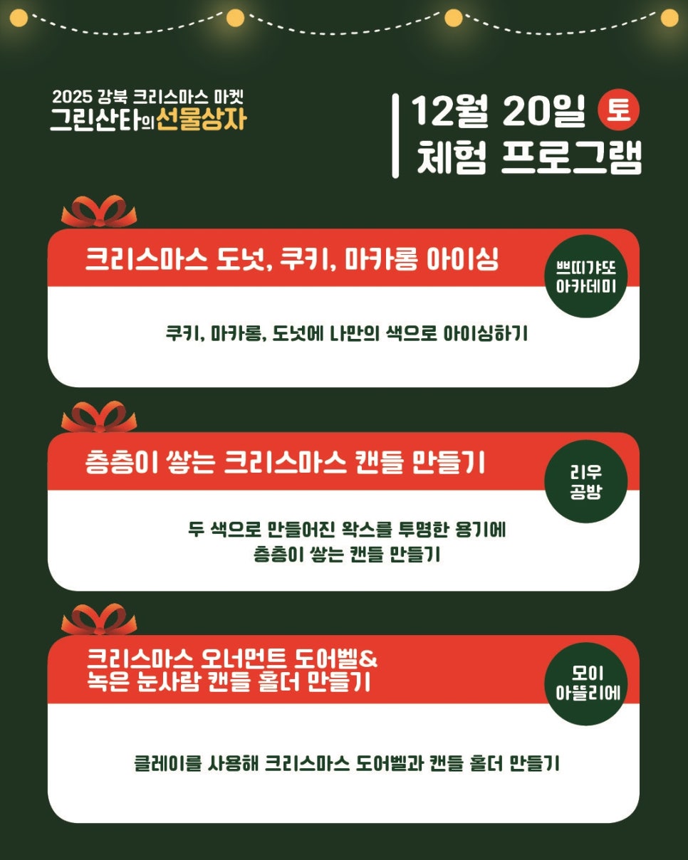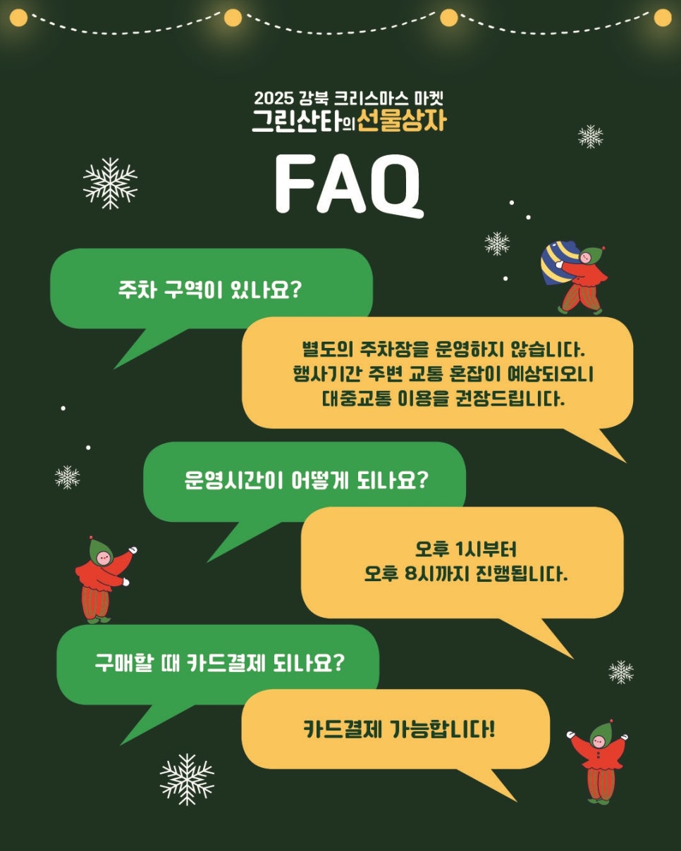 드디어 우리 마을에 오십니다. 북한산처럼 초록초록한 그린산타 할아버지가 강북구에 오십니다. 오예~~~~~~~~~~~~ 모두의 즐거운 축제를 만끽할 수 있도록 방문인증 이벤트를 준비했거든요. 축제 현장 곳곳에 있는 특별한 포토존을 배경으로 찍으셔도 좋고, 크리스마스 마켓에서 구입하신 물건 or 맛있게 드신 음식과 함께 찍으셔도 좋고 행사 이름이 잘 보이도록 영상 또는...
