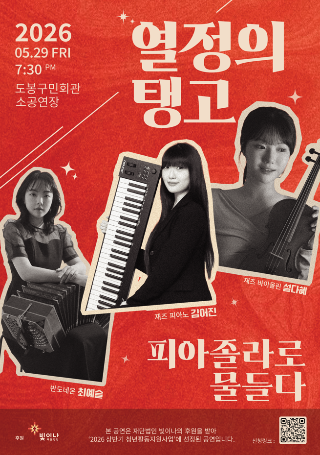 안녕하세요! 하나비 앙상블 입니다. 5월 29일 오후 7시 30분 도봉구민회관 소공연장에서 열정의 탱고 - 피아졸라로 물들다 공연을 진행합니다. 무료 공연이라 편하게 오실 수 있습니다. 많은 관심 부탁드립니다! 하나비 앙상블 반도네온 최예슬 재즈 피아노 김어진 재즈 바이올린 설다혜 장소: 도봉구민회관 소공연장 일자: 5월 29일 금요일 오후 7시 30분 예매: https://naver.me/xTyRA9PB