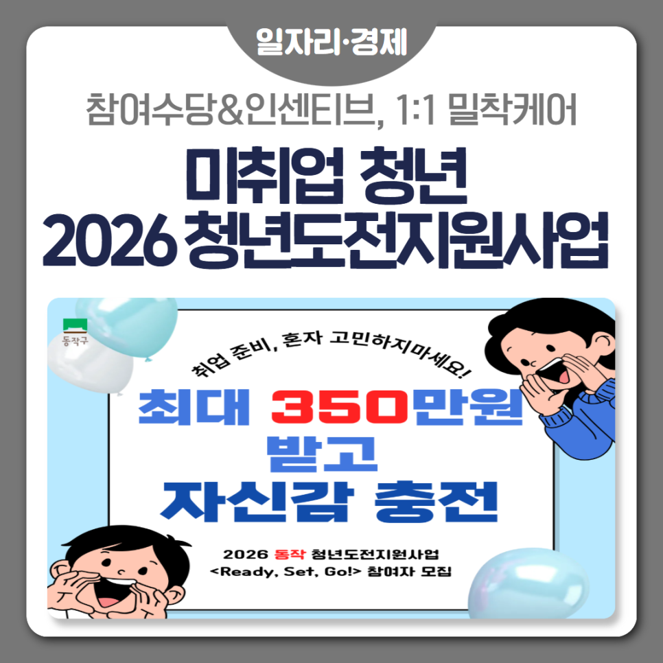 구직을 잠깐 멈춘 청년을 위한 ‘다시 시작’ 프로그램 취업 준비를 하다 보면 어느 순간 속도가 나지 않을 때가 있어요. 청년도전지원사업은 구직을 잠시 멈췄거나 취업 준비에 어려움을 겪는 청년이 다시 사회로 나아갈 수 있도록 진로탐색·취업역량 강화 등 맞춤형 프로그램을 제공하는 사업입니다. 이런 분들께 해당되어요. 신청일 이전 6개월 이상 취(창)업·교육·직업훈련 ...