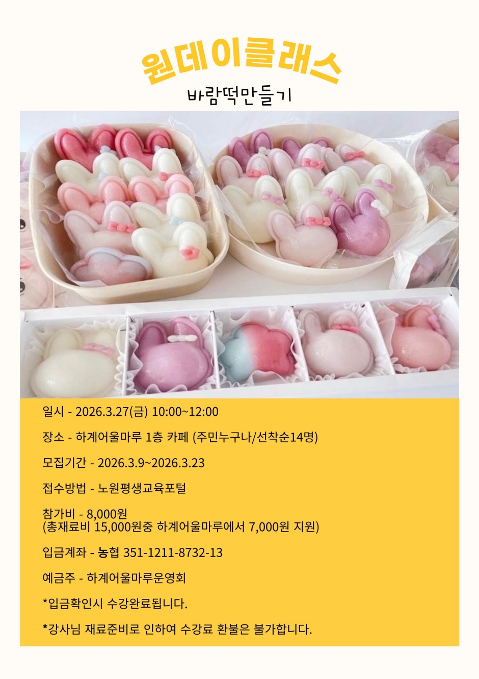 하계어울마루 <원데이클래스 바람떡 만들기> 신청기간 26.03.09_11:00 ~ 26.03.23_16:00 진행일자 26.03.27 (금) / 10:00 ~ 12:00 대상 지역주민 14명 장소 하계어울마루 1층 카페(공릉로58가길13) 수강료 8,000원(총 재료비 15,000원 중 하계어울마루에서 7,000원 지원) 접수방식 온라인(선착순) o 선착순 접수이며, 12시간 내 참가비 입금 시 최종 확정됩니다. o 재료 준비로 인하여 입금 후 수강료 환불은 불가합니다. 문의전화 02-976-4693