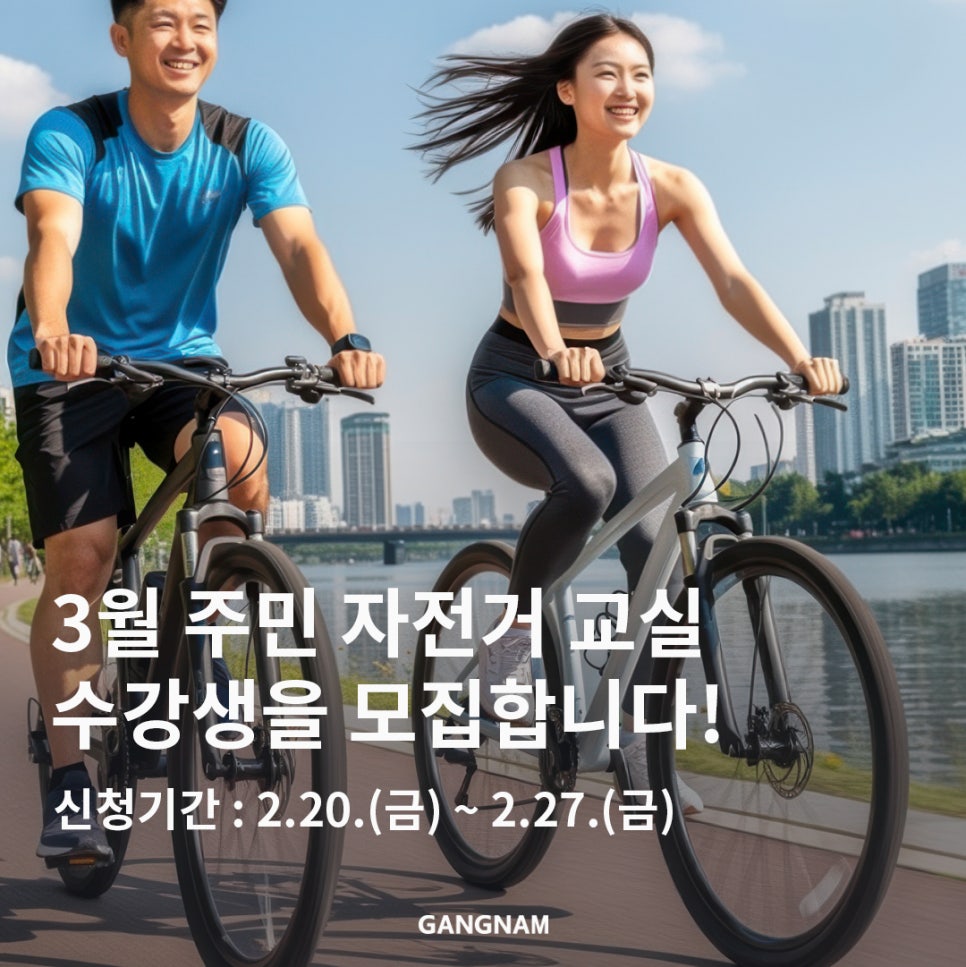 ▣ 자전거 교실 수강 신청 안내 - 신청대상 : 강남구 거주 성인남녀 - 신청기간 : 2.20.(금) ~ 2.27.(금) - 수강기간 : 3.1.(일) ~ 3.31.(화) - 수강료 안내 : 초급반 (무료), 중급반 (1만원, 1개월 수강료) - 신청방법 ① 온라인 신청 : 강남구청 홈페이지 회원가입 후 신청! 【강남구청 메인화면 ⇒ 소통·참여 ⇒ 교육·강좌 ⇒ 자전거 ...】