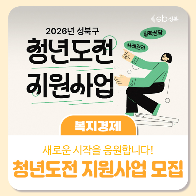 안녕하세요 성북누리입니다. 취업에 대한 부담감 때문에 잠시 멈춰 서 있는 청년들을 위해 <2026 성북구 청년도전 지원사업> 참여자를 모집합니다. 🎯 2026 성북구 청년도전 지원사업 참여자 모집 📆 모집기간 2026년 4월부터 상시모집(프로그램별 모집인원 충족 시 조기 마감) ✅ 모집인원 총 104명(단기 24명 / 중기 52명 / 장기 28명) 📍 장 소 서울청년센터 성북(서울 성북...