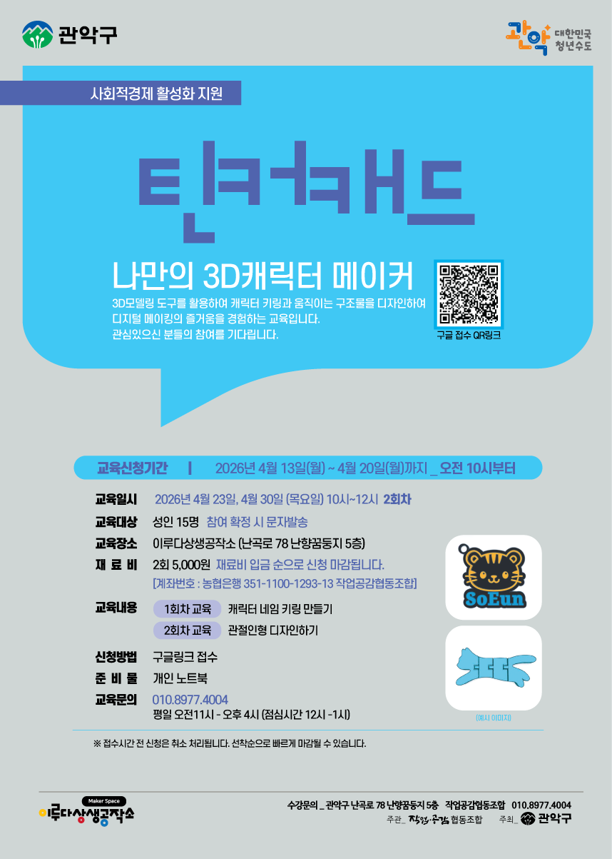 3D모델링 도구를 활용하여 캐릭터 키링과 움직이는 구조물을 디자인하여 디지털 메이킹의 즐거움을 경험하는 교육입니다. 관심있으신 분들의 참여를 기다립니다. ✅ 교육기간 : 2026년 4월 23일, 4월 30일(목요일) / 10시~12시 2회차 ✅ 교육장소 : 이루다상생공작소 (난곡로78, 난향꿈둥지 5층) ✅ 교육대상 : 성인 ✅ 모집인원 : 15명 이내 ✅ 준 비 물 : 개인 노트북 ✅ 교육비용 : 5,000원(2회) / 재료비 입금 순으로 신청 마감됩니다. 【계좌번호 : 농협은행 351-1100-1293-13 작업공감협동조합】 ✅ 접수기간 : 2026년 4월 13일(월) 오전 10시부터~ 4월 20일(월) 오후5시까지(시간엄수) ※ 접수시간 전 신청은 취소 처리됩니다. ※ 선착순으로 빠르게 마감될 수 있습니다 ✅ 접수방법 : 구글접수 https://forms.gle/c7kiB61ui3TT9p6x6 ※ 4월 13일(수) 오전 10시에 구글폼 내용이 업데이트됩니다. ✅ 기타문의 : 작업공감협동조합(☎ 010-8977-4004) ※ 문의시간 : 평일 오전11시~오후4시 (점심시간 12~1시 제외)