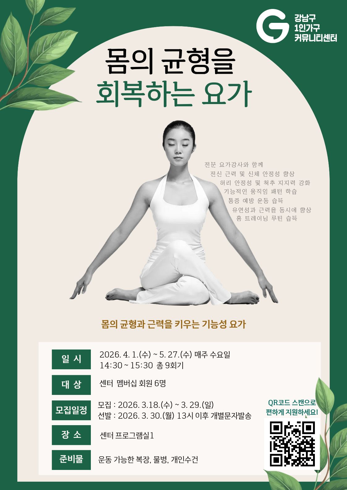 ● 사 업 명 : 몸의 균형을 회복하는 요가 ● 모집대상 : 센터 멤버십 회원 ● 모집인원 : 6명 ● 모집기간 : 2026.3.18.(수)~3.29.(일) / 3.30.(월) 13시 이후 선발인원 개별문자발송 ● 진행기간 : 2026.4.1.(수) ~ 5.27.(수) 매주 수요일 14:30~15:30 총 9회기 ● 진행장소 : 강남구 1인가구 커뮤니티센터 프로그램실 1 ● 접수방법 : 포스터 내 QR 접속 / 강남구 1인가구 커뮤니티센터 홈페이지 신청 ( https://www.gangnam1.org/ ) ● 문의방법 : 강남구 1인가구 커뮤니티센터 ☎02-552-1101 ※ 자세한 사항은 ( https://www.gangnam1.org/ ) 참고 바랍니다.