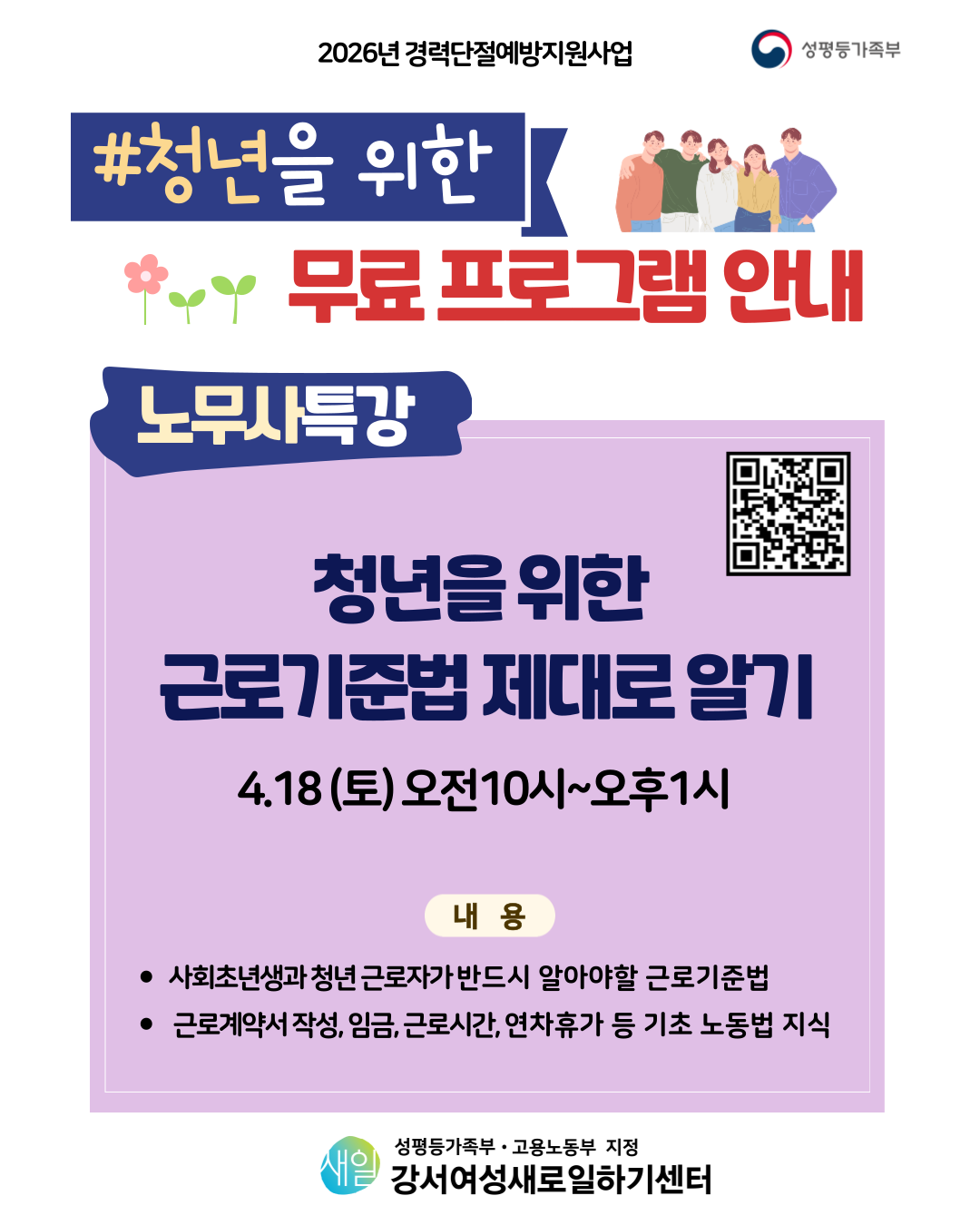 📌 첫 직장, 알바, 인턴 시작했다면 꼭 알아야 하는 근로기준법 특강 근로계약서 제대로 쓰는 방법부터 연차·임금·근로시간까지 직장생활에서 꼭 필요한 ‘내 권리’를 쉽게 알려드립니다. 헷갈렸던 노동법, 이번 기회에 정리해 보세요. 📚 [청년특강] 청년을 위한 근로기준법 제대로 알기 📅 일시 4월 18일(토) 10:00 ~ 13:00 👤 대상 20~30대 청년 누구나 (남녀 무관 / 10명 선발) 📍 장소 강서여성새로일하기센터 강의실 2 (양천향교역 7번 출구 도보 5분) ✅ 참여 신청 https://docs.google.com/forms/d/e/1FAIpQLScWABF0jExP0VMHG2XLTsLCwirZ5ko72cxabGli1TB0H8tD-w/viewform 🚇 대중교통 이용 부탁드립니다 ※ 주차비 지원은 어려워요 📞 문의 02-2692-4549 ⚠️ 신청 후 무단 불참 시 다음 프로그램 참여가 제한될 수 있어요 알면 든든한 노동법, 직장생활 시작 전에 챙겨보세요 🙂