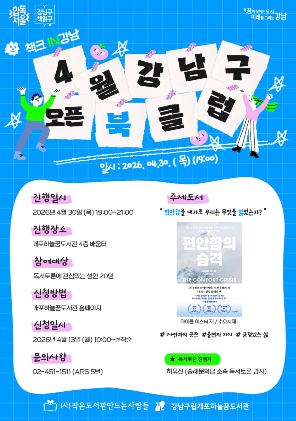 ● 활 동 명 : 4월 강남구 오픈 북클럽 책크in 강남 ● 활동내용 : 주제도서 '편안함의 습격'을 중심으로 한 오프라인 독서토론 ● 모집대상 : 독서토론에 관심있는 성인 ● 모집인원 : 20명 ● 모집기간 : 2026년 4월 13일(월) 10:00~ 선착순 ● 진행일시 : 2026년 4월 30일 (목) 19:00 ● 진행장소 : 개포하늘꿈도서관 4층 배움터 ● 접수방법 : 도서관 홈페이지 신청 ( https://library.gangnam.go.kr/hnkklib/menu/13198/program/30013/lectureDetail.do?currentPageNo=1&searchCategory=&manageCd=MM&searchStatusCd=&lectureIdx=32645 ) ● 문의방법 : 강남구립개포하늘꿈도서관 02-451-1511 ※ 자세한 사항은 ( https://library.gangnam.go.kr/hnkklib/menu/13198/program/30013/lectureDetail.do?currentPageNo=1&searchCategory=&manageCd=MM&searchStatusCd=&lectureIdx=32645 ) 참고 바랍니다.
