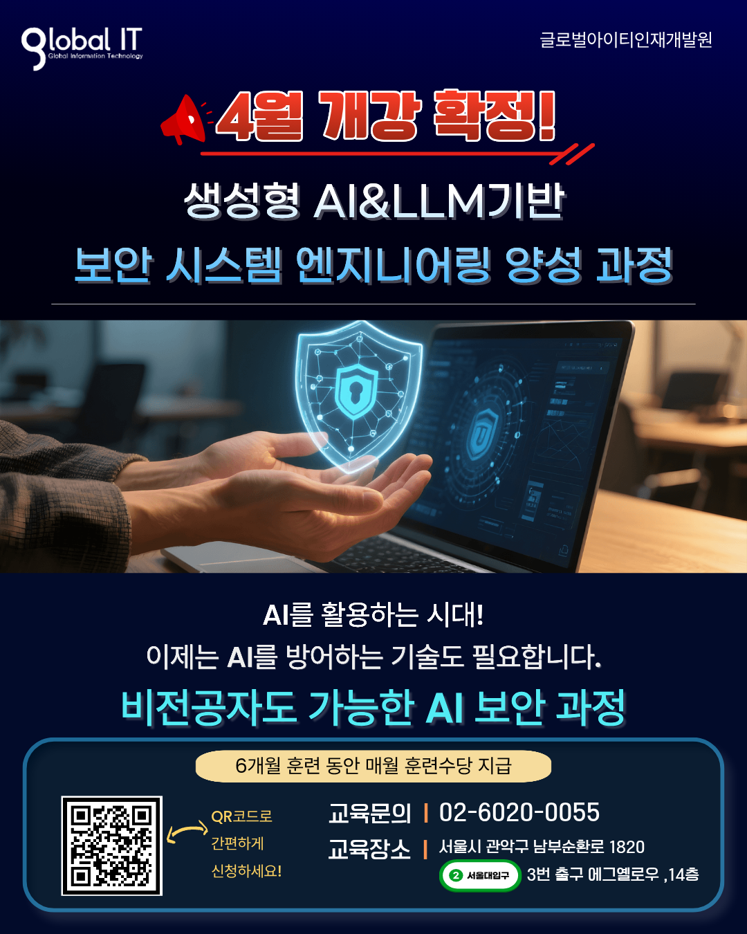 [4월 개강 확정] 미래를 여는 AI 보안, 당신도 전문가가 될 수 있습니다! 2회차 교육, 드디어 4월 개강 확정! 전공자가 아니어도 괜찮습니다. 기초부터 실무까지 탄탄하게 채워드리는 'AI 보안 시스템 엔지니어 양성 과정'에 도전하세요. 교육 내용: 생성형 AI&LLM 기반 보안 시스템 엔지니어 양성 과정 수강 혜택: 국비지원 무료 교육 (참여 유형에 따라 달라질 수 있습니다) 개강일: 2026년 4월 28일 지금 바로 상담 신청하기 [신청 링크 주소] https://forms.gle/FqEoLkCUTQRAkmwM6 ※ 조기 마감될 수 있으니 서둘러 신청해 주세요! 글로벌아이티인재개발원 인스타그램 [인스타 링크 주소] https://www.instagram.com/globalit_sns/ 글로벌아이티인재개발원 홈페이지 [홈페이지 링크 주소] https://gith.co.kr/ 전화상담 : 02-6020-0055