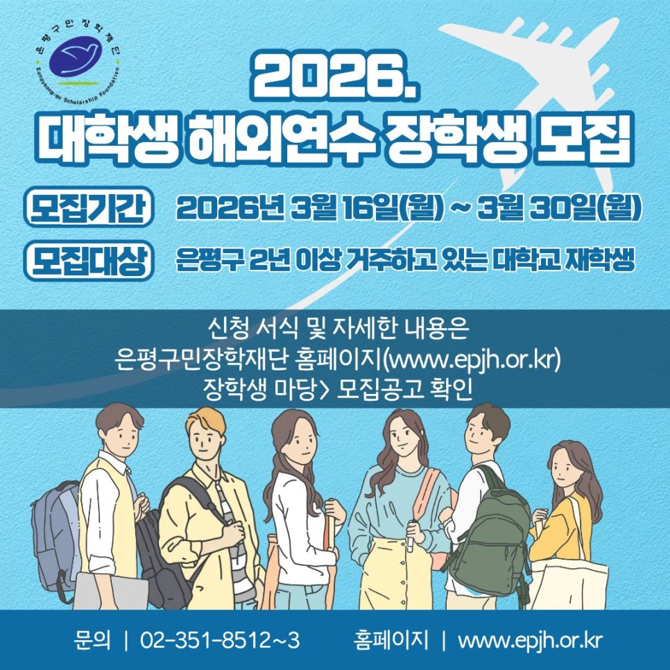 대학생 해외연수장학생 선발은 평구 교육환경을 개선하고 우수한 인재를 발굴·육성하기 위하여 설립된 은평구민장학재단에서 2026. 해외연수장학생 선발합니다. ✅ 선발 분야 대학생 해외연수장학생 ✅ 선발 인원 6명 내외 ✅ 연수 대학 샌프란시스코 주립대학 (1600 Holloway Avenue, HUM 101, San Francisco, CA 94132) ✅ 연수 일정 🔹 출국 2026....
