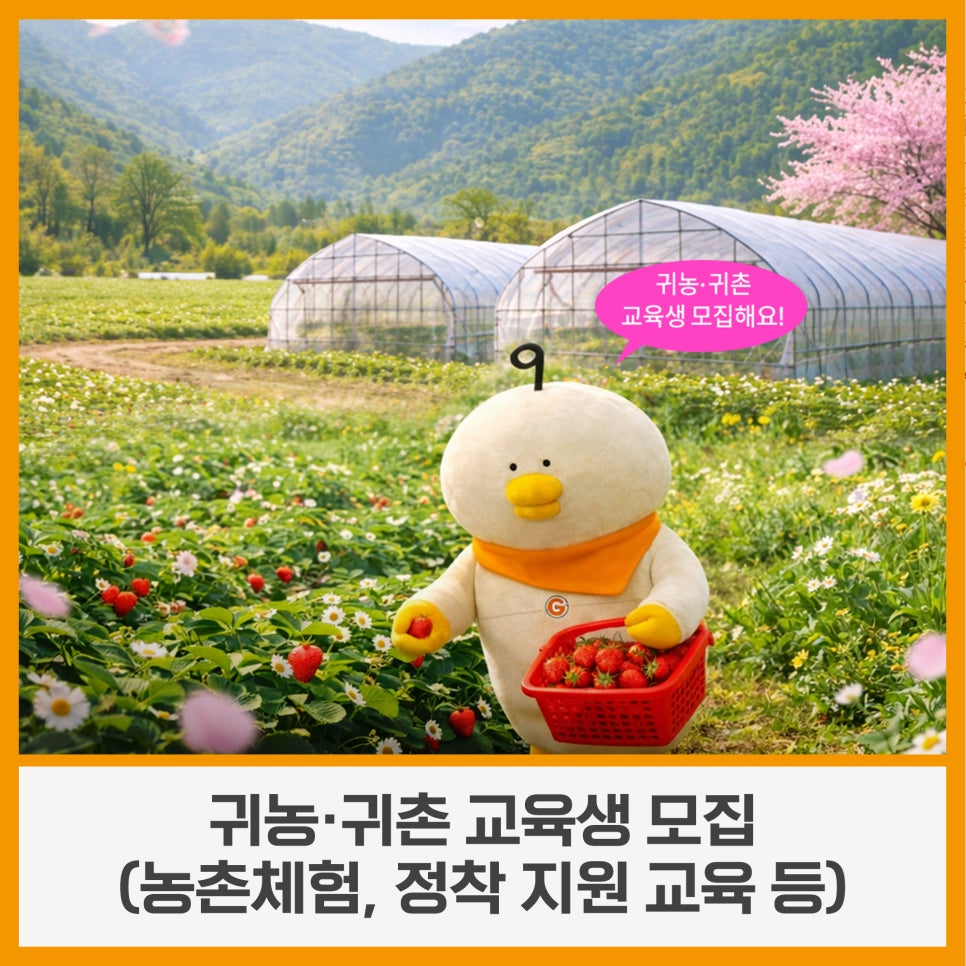 귀농·귀촌 교육생 모집(농촌체험, 정착 지원 교육 등) 구로구가 귀농·귀촌을 고민하는 주민과 직장인을 위해 맞춤형 교육 프로그램을 운영합니다! ' 나에게 시골생활이 맞을까? ' ' 무엇부터 준비해야 하지? ' 고민이라면 이번 교육을 통해 직접 배우고, 경험하고, 확인해보세요! 🌱 ✅ 운영기간 2026. 4. 6. ~ 7. 13. 매주 월요일, 18:30 ~ 20:30 및 주말 ...