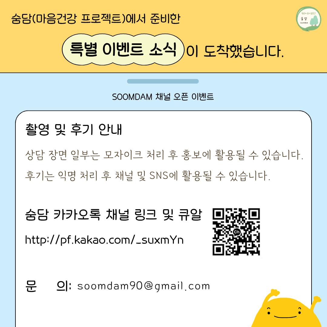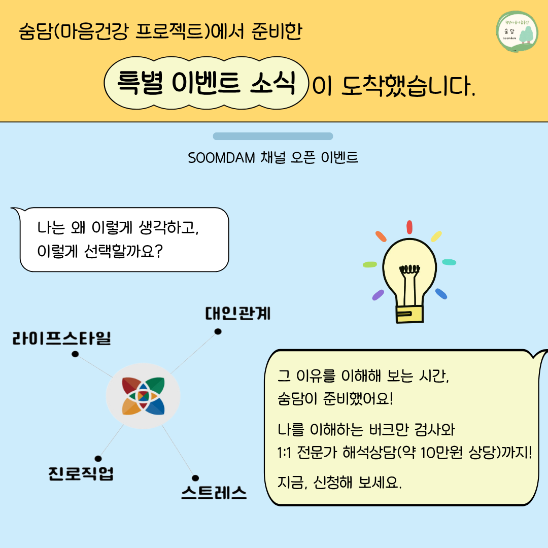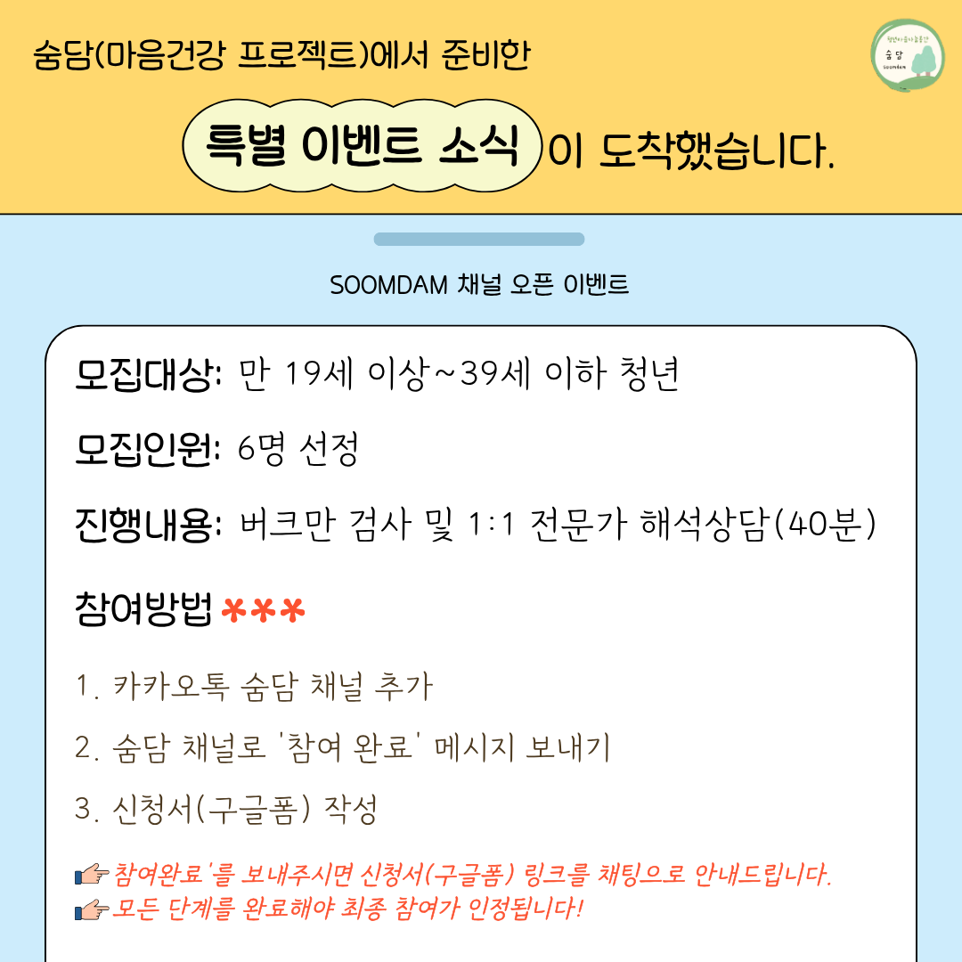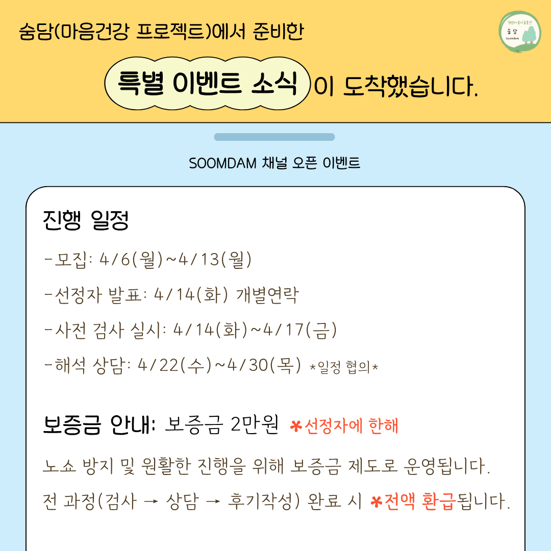 여러분 , 안녕하세요 ! 숨담에서 채널 오픈 기념으로 , 버크만 검사 & 해석상담 이벤트를 준비했습니다 . “ 나는 왜 이렇게 생각하고 , 이렇게 선택할까요 ?” 라이프 스타일 , 대인관계 , 진로직업 , 스트레스까지 우리는 다양한 영역에서 비슷한 고민과 선택을 반복합니다 . 이번 특별 이벤트에서는 버크만 검사를 통해 겉으로 보이는 모습뿐 아니라 내가 편안함을 느끼는 방식 , 그리고 스트레스를 받는 지점까지 이해해 보는 시간을 가져봅니다 . 그리고 그 결과를 바탕으로 1:1 전문가와 함께 나에 대해 이야기 나눠보는 알찬 시간을 준비했어요 . ▶ 프로그램 안내 - 버크만 검사 진행 -1:1 전문가 해석상담 ( 약 40 분 ) ▶ 참여 대상 - 만 19 세 이상 ~ 39 세 이하 청년 ▶ 모집 인원 -6 명 선정 ▶ 참여 방법 1. 카카오톡 ‘ 숨담 ’ 채널 추가 2. 채널로 ‘ 참여완료 ’ 메시지 보내기 3. 신청서 ( 구글폼 ) 작성 👉 ‘ 참여완료 ’ 메시지를 보내주시면 신청서 링크를 채팅으로 안내드립니다 . 👉 모든 단계를 완료해야 최종 참여가 인정됩니다 . ▶ 진행 일정 - 모집 : 4/6( 월 ) ~ 4/13( 월 ) - 선정자 발표 : 4/14( 화 ) 개별 연락 - 사전 검사 : 4/14( 화 ) ~ 4/17( 금 ) - 해석 상담 : 4/22( 수 ) ~ 4/30( 목 ) 일정 협의 ▶ 보증금 안내 - 보증금 2 만원 ( 선정자에 한해 ) - 노쇼 방지 및 원활한 진행을 위해 운영되며 , 전 과정 ( 검사 → 상담 → 후기작성 ) 완료 시 전액 환급됩니다 . ▶ 촬영 및 후기 안내 - 상담 장면 일부는 모자이크 처리 후 홍보에 활용될 수 있습니다 . - 후기는 익명 처리 후 채널 및 SNS 에 활용될 수 있습니다 . ▶ 참여 링크 - 카카오톡 채널 : http://pf.kakao.com/_suxmYn ▶ 문의 soomdam90@gmail.com 숨담이 궁금하다면? https://soomdam.cafe24.com/