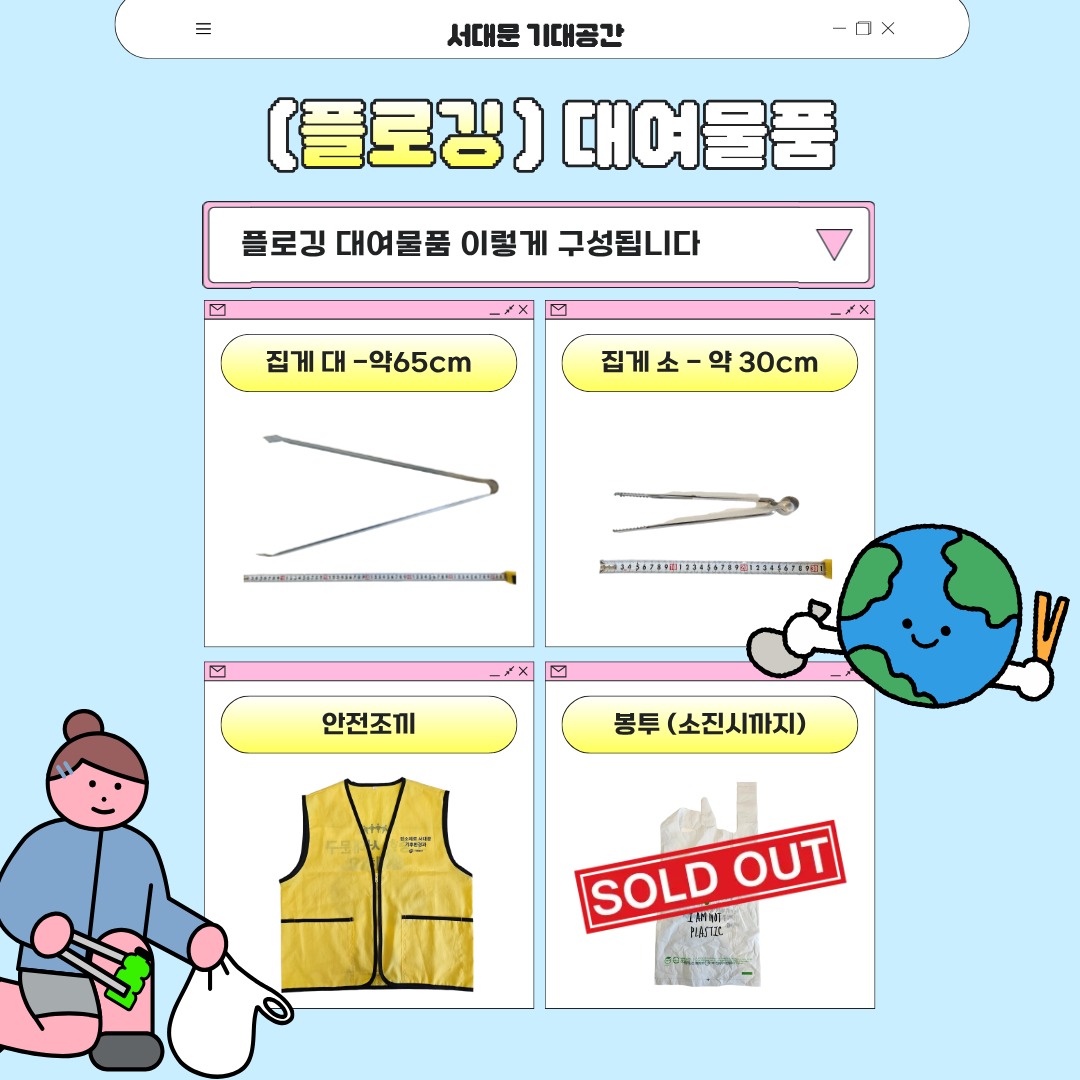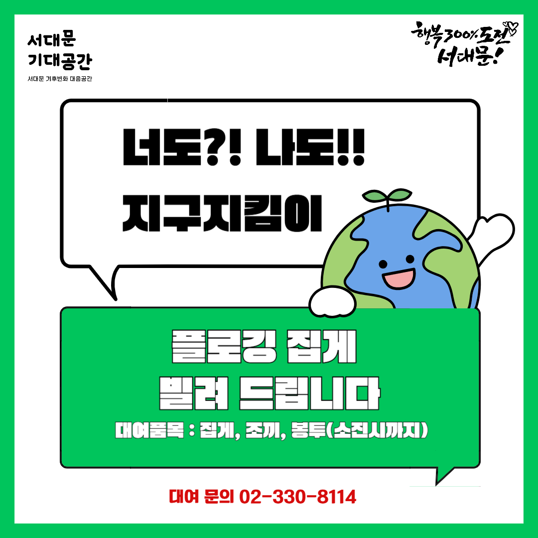 서대문 기대공간에서는 플로깅 활성화를 위해 플로깅 집게를 빌려드리고 있습니다. 집게 사지 말고 기대공간에서 빌리세요. 대여품목 : 집게(대, 소), 조끼 신청방법 : 전화신청 ★ 플로깅 진행 후 키트 반납시 플로깅 사진 제출 필수 수령방법 : 수령일시에 맞춰 기대공간 방문하여 수령 위치 : 서대문구 응암로2길 15(북가좌동) 문의 : 서대문 기대공간 02-330-811...