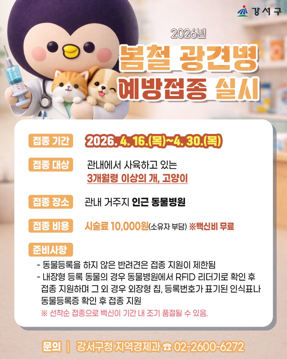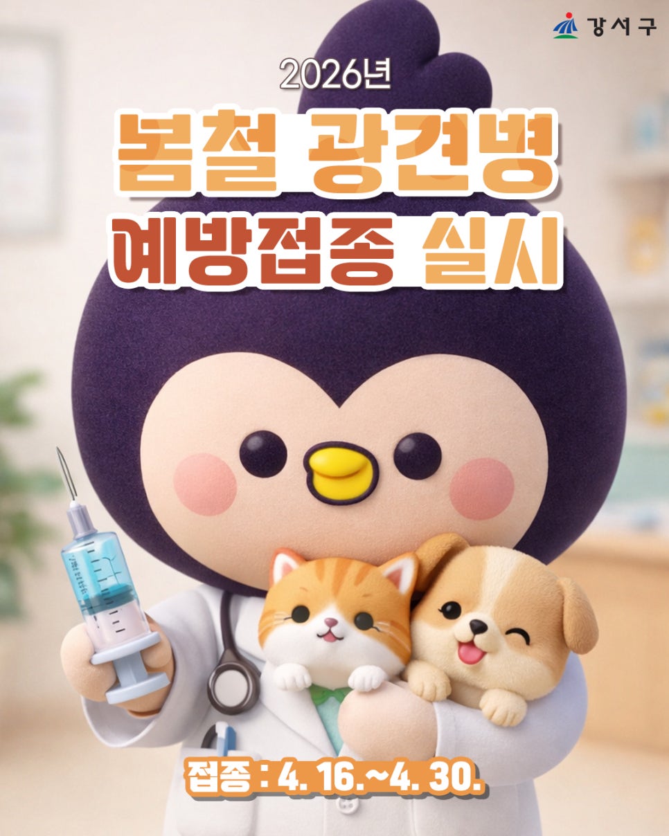 반려견, 반려묘와 함께 생활하고 계신다면 봄철 광견병 예방접종 꼭 챙기셔야 하는데요! 강서구에서는 2026년 4월 16일부터 4월 30일까지 관내 동물병원에서 광견병 예방접종 지원을 실시합니다! ✅ 접종 기간 2026. 4. 16.(목) ~ 4. 30.(목) ✅ 접종 대상 강서구 관내에서 사육 중인 3개월령 이상의 개, 고양이 ✅ 접종 장소 거주지 인근 관내 동물병원 ✅ 접종 비용...