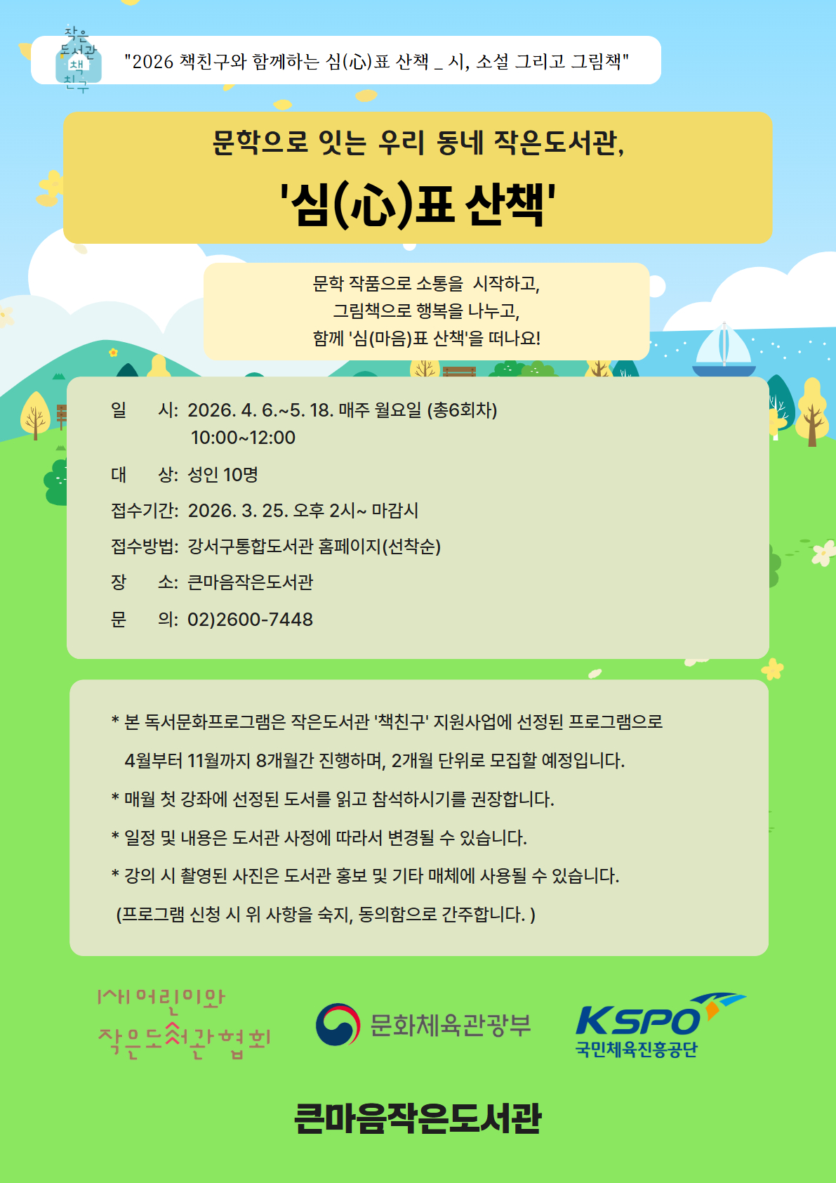 강서구립큰마음작은도서관에서 책친구와 함께 문학과 그림책을 즐기는 프로그램을 운영 중이야. 혼자라도 괜찮아, 함께 책 이야기 나눠봐!
