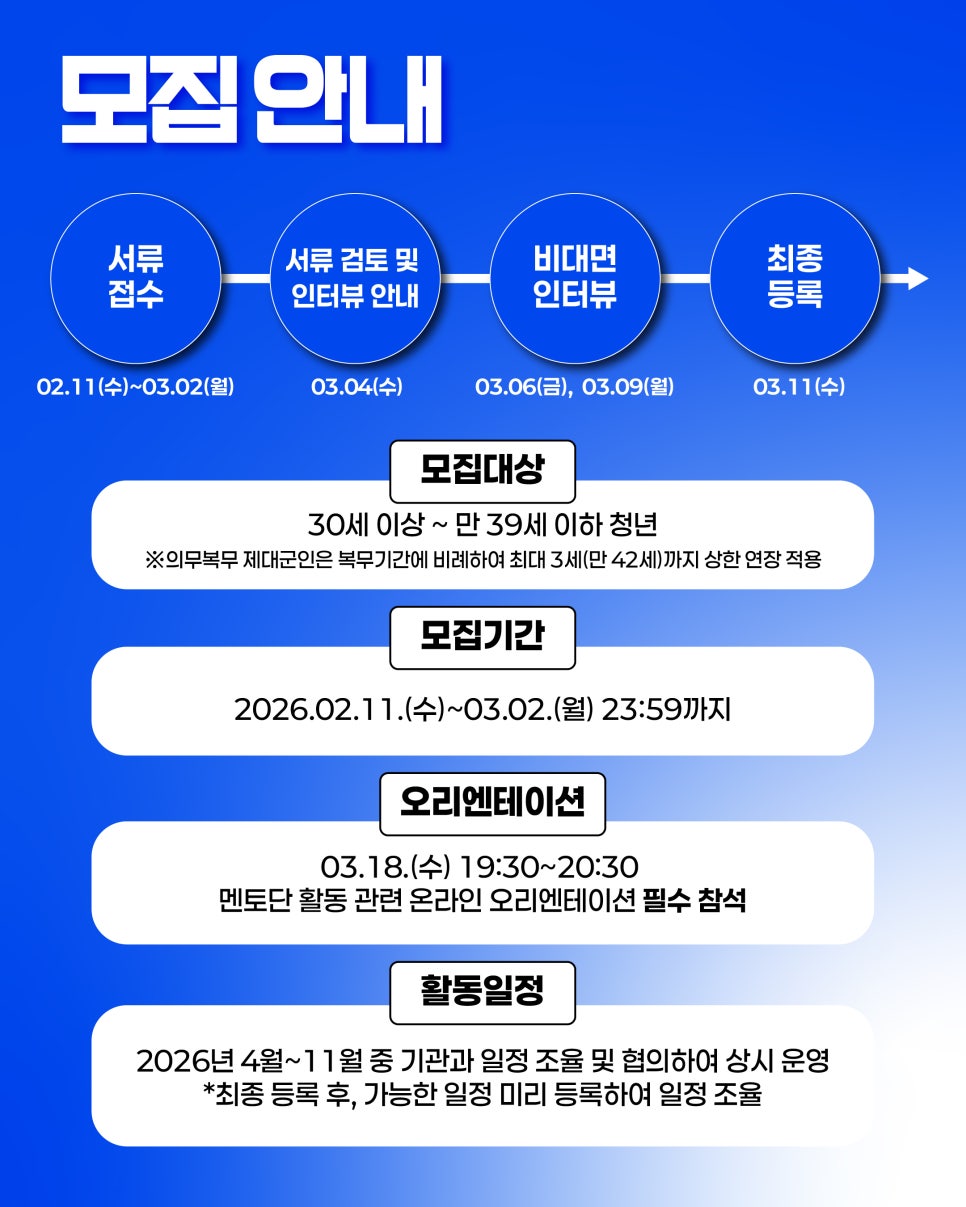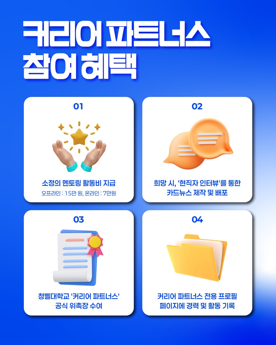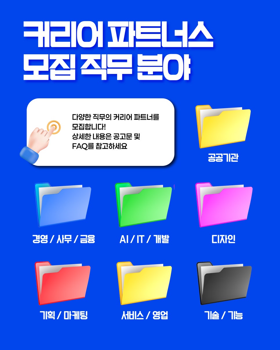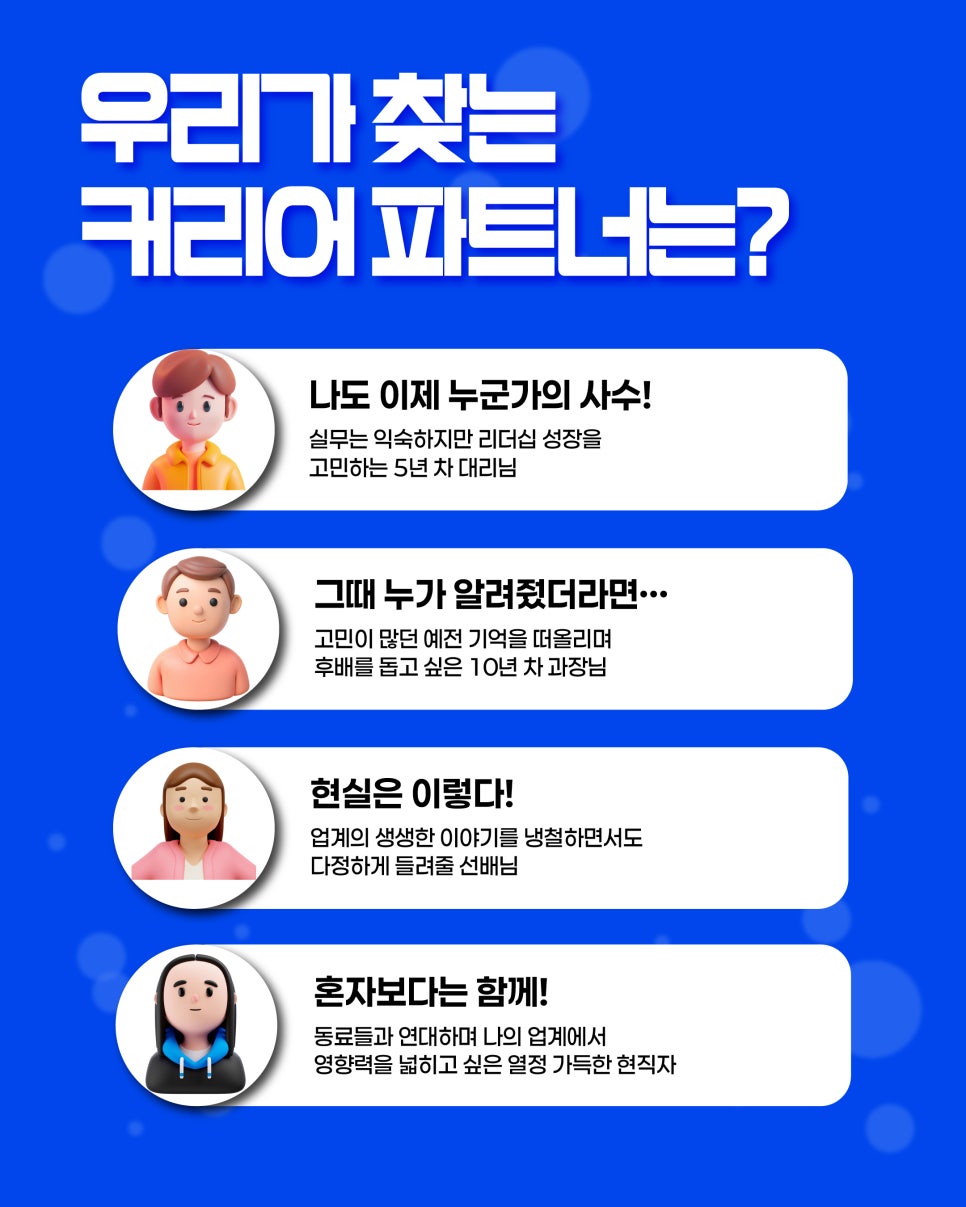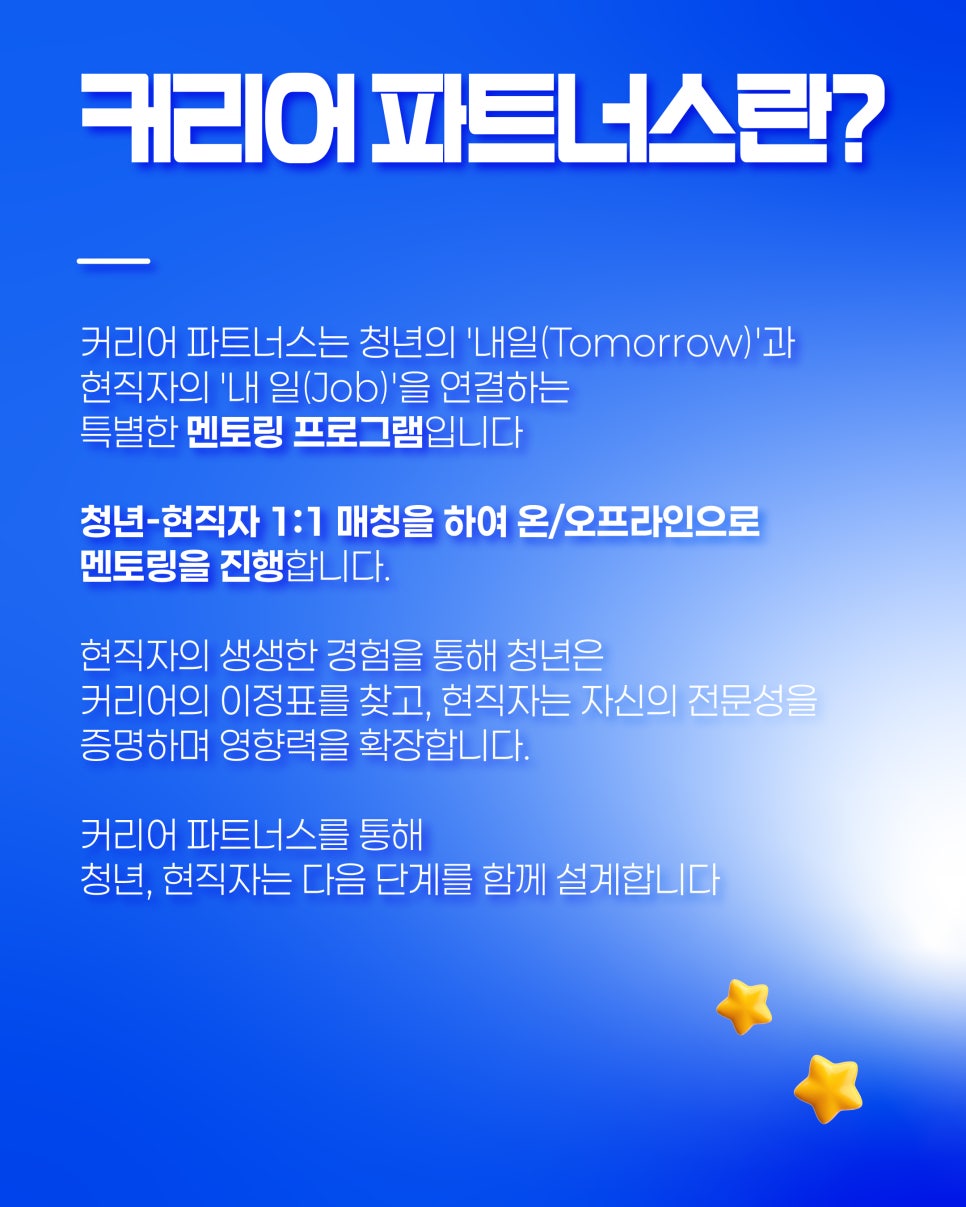 커리어 파트너스는 현직자의 생생한 경험을 통해 청년의 ‘내일(Tomorrow)’과 현직자의 ‘내 일(Job)’을 연결하는 특별한 멘토링 프로그램입니다. 모집대상 30세~만 39세 청년 중 실무 경력...