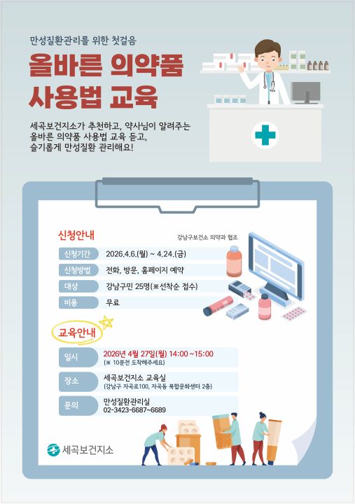 약사님이 알려주는 올바른 의약품 사용법 교육듣고 슬기롭게 만성질환 관리하세요~!!♥ 내 용 : 올바른 의약품 사용법♥ 장 소 : 세곡보건지소 교육실(강남구 자곡로100, 자곡복합문화센터 2층)♥ 신 청 : 보건소 홈페이지 "교육신청" 온라인 신청, 전화(02-3423-6687~6689) 또는 방문신청