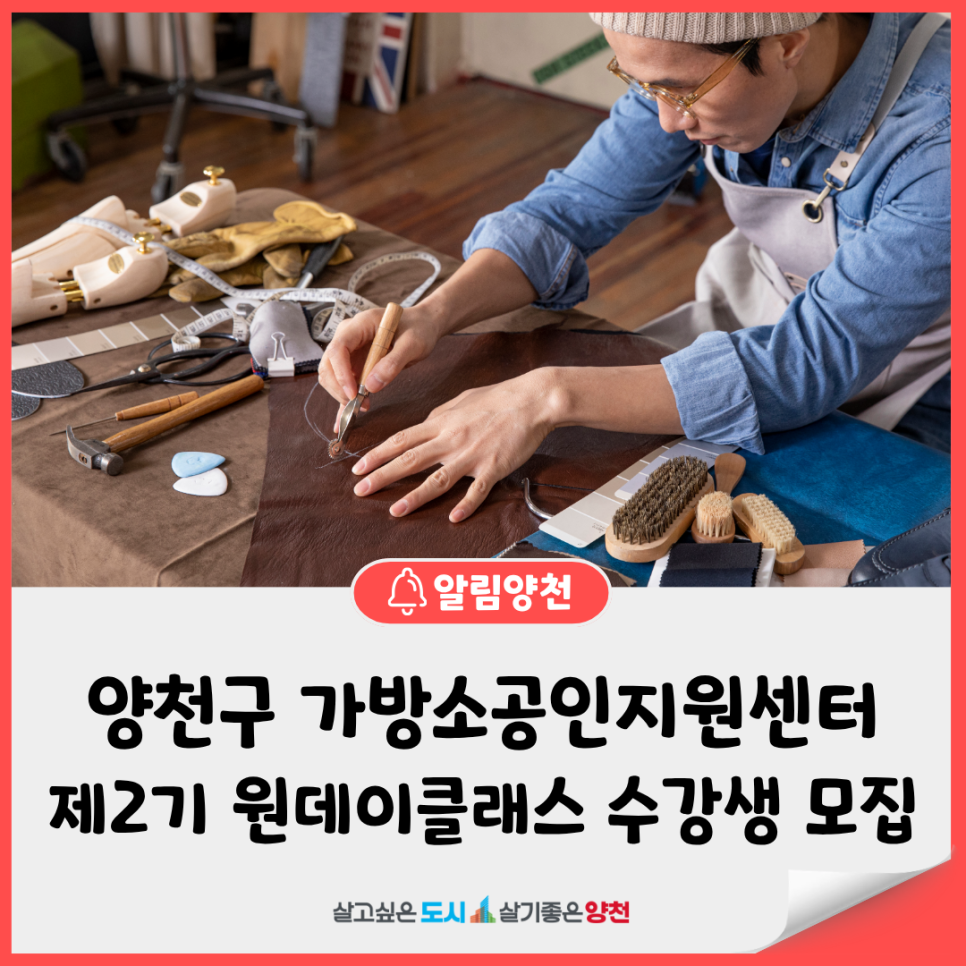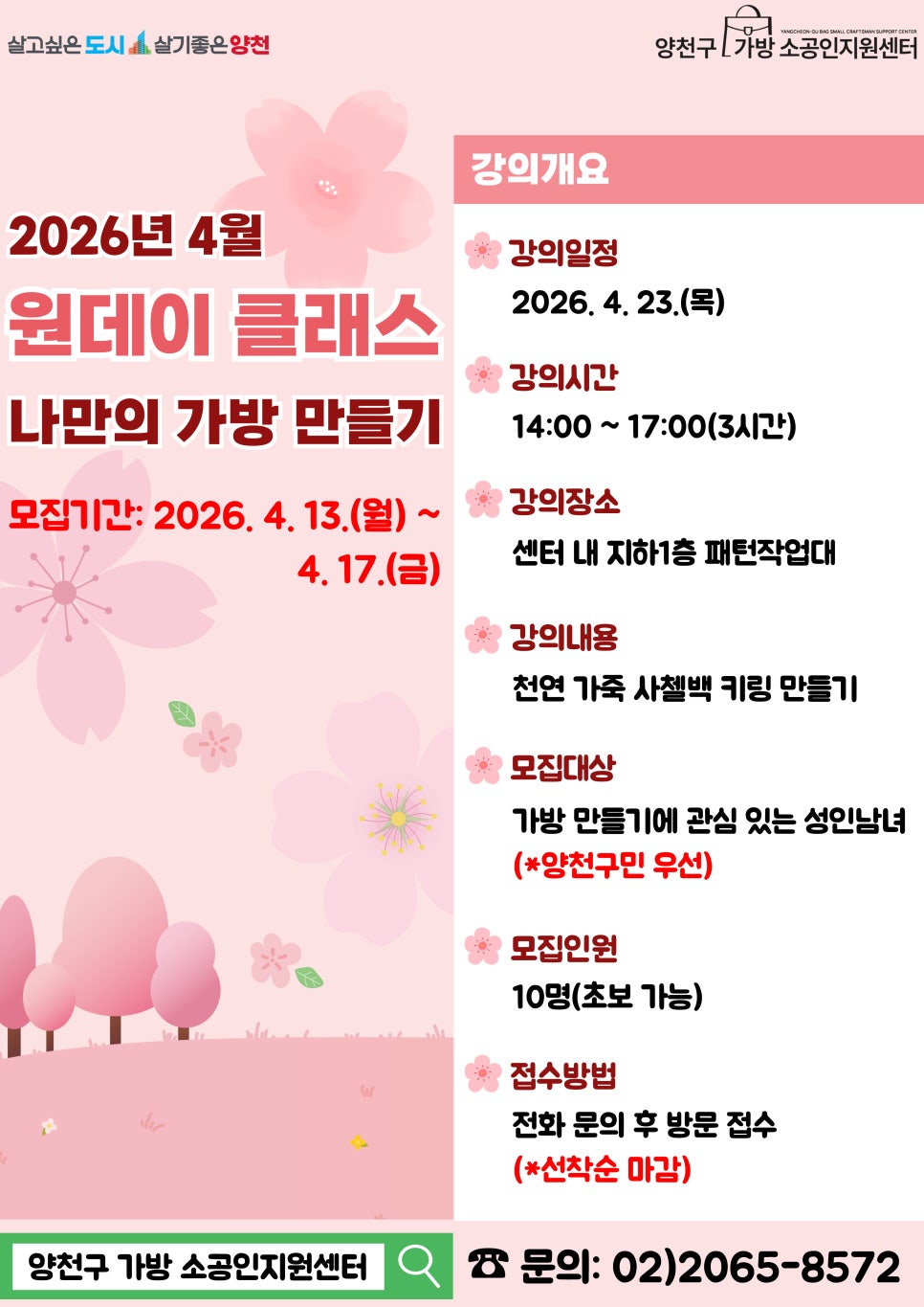 양천구 가방 소공인지원센터에서 제1기 원데이 클래스에 이어 이번에는 나만의 가방 키링을 완성해보는 뜻깊은 시간을 마련했습니다. !! 어렵지 않을까 고민하셨나요? 초보자도 환영합니다! 👜 내 손으로 직접 만드는 데일리 필수템 '나만의 가방 만들기 제2기 원데이 클래스' 수강생을 모집합니다. 모집기간: 2026. 4. 13.(월) ~ 4. 17.(금) 모집대상: 가방 만들기에 관심 있는 성...