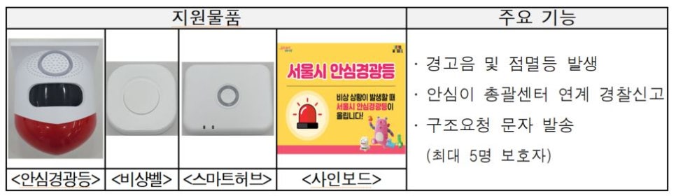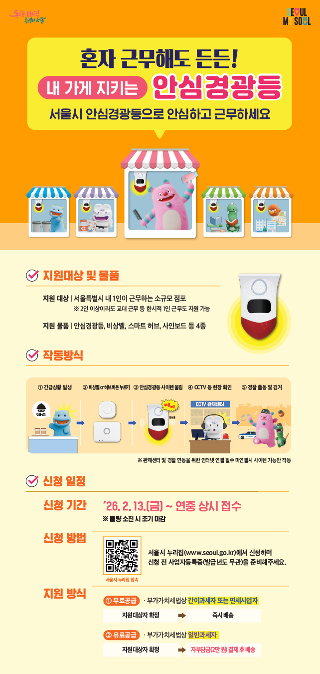 ㅇ(지원대상) 서울시 1인 근무 소규모 점포 ㅇ(지원수량) 5,000개 ※ 지원 추이에 따라 하반기 추가 제조·구매 예정 ㅇ(지원내용) 안심이총괄센터 연계 긴급신고가 가능한 안심경광등 지원 ㅇ(배부방법) 택배발송 - 개별 설치 원칙이나 설치에 어려움을 겪는 일부 점포 설치지원 □신청 및 접수 ㅇ(신청일정) ’26. 2. 13.(금) 16:00 ~ 연중 상시 ㅇ(신청방법) 서울시 누...