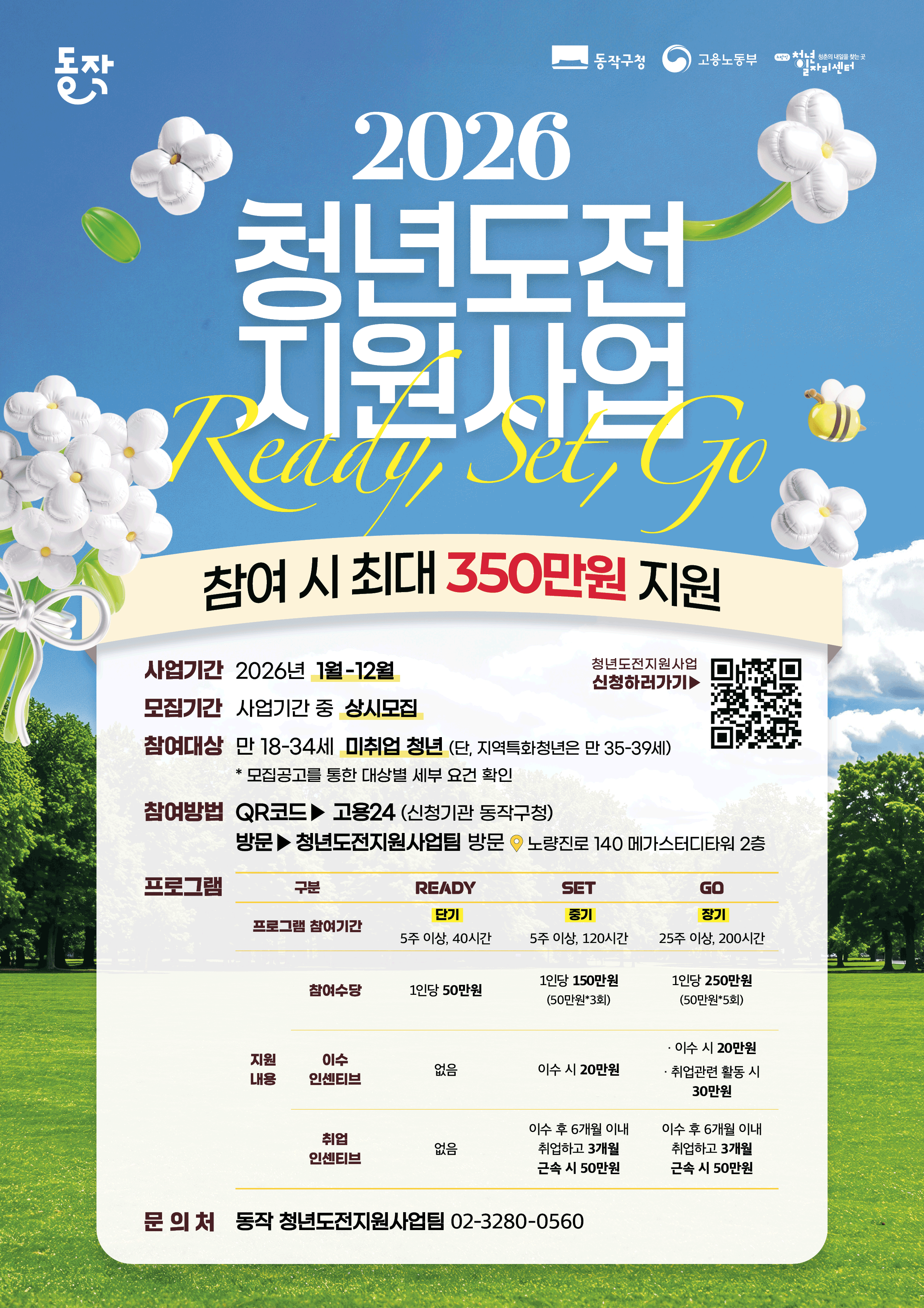 1. 목적 구직단념청년을 대상으로 구직 의욕을 고취하고 자신감을 강화하기 위한 맞춤형 프로그램을 제공합니다. 이를 통해 청년들의 원활한 사회 진입을 돕고 취업 역량을 강화하는 것을 목적으로 합니다 2. 신청대상 6개월 이상 취업·교육·직업훈련 이력이 없는 만 18세~34세 청년 (단, 동작구 조례에 근거하여 19~39세 청년도 포함 가능) 3. 신청기간 2026. 4~ 마감 시 까지 4. 진행일정 • 단기 프로그램 (5주 이상): 2026년 5월 4일 ~ 2026년 6월 7일 * 일정은 예정사항이며 변동될 수 있습니다. 5.진행내용 • 밀착상담 (기초상담 등) • 사례관리 (스트레스 관리, 근로기준법의 이해 등) • 자신감 회복 (퍼스널컬러 등) • 진로 탐색 (직업체험 등) • 취업 역량 강화 (면접 대비, 비즈니스 매너 등) 6. 진행장소 노량진청년일자리센터 (서울시 동작구 노량진로 140, 메가스터디타워 2층) 7. 참여혜택 • 단기 (5주): 50만 원 8.문의 • 전화: 동작 청년도전지원사업팀 (☎ 02-3280-0560) • 방문: 노량진청년일자리센터 청년도전지원사업팀 사무실 (메가스터디타워 2층)