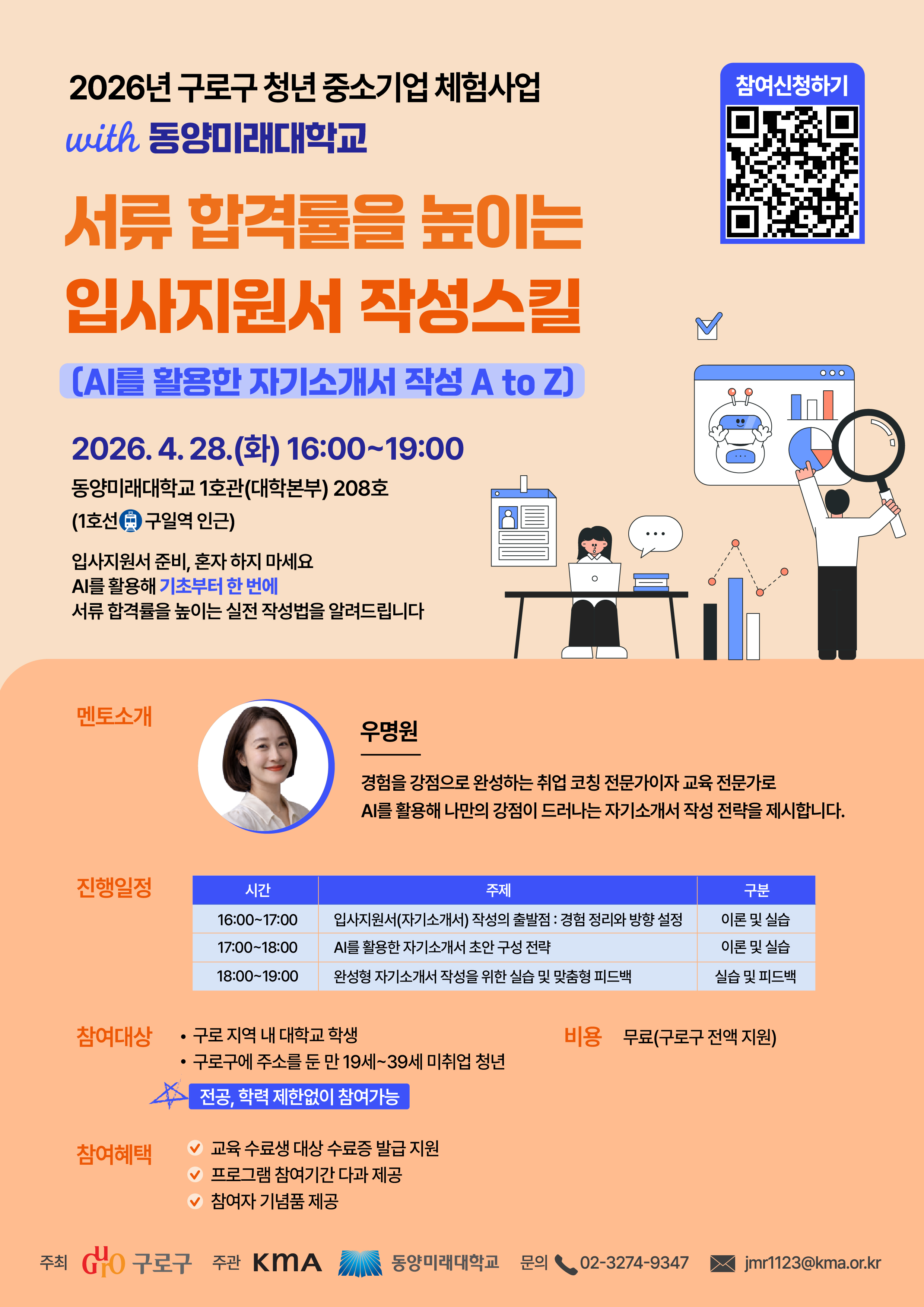 구로구 청년 중소기업 체험 사업의 일환으로 진행하는 입사지원서 작성 스킬 교육을 아래와 같이 안내드리오니 많은 관심 부탁드립니다.