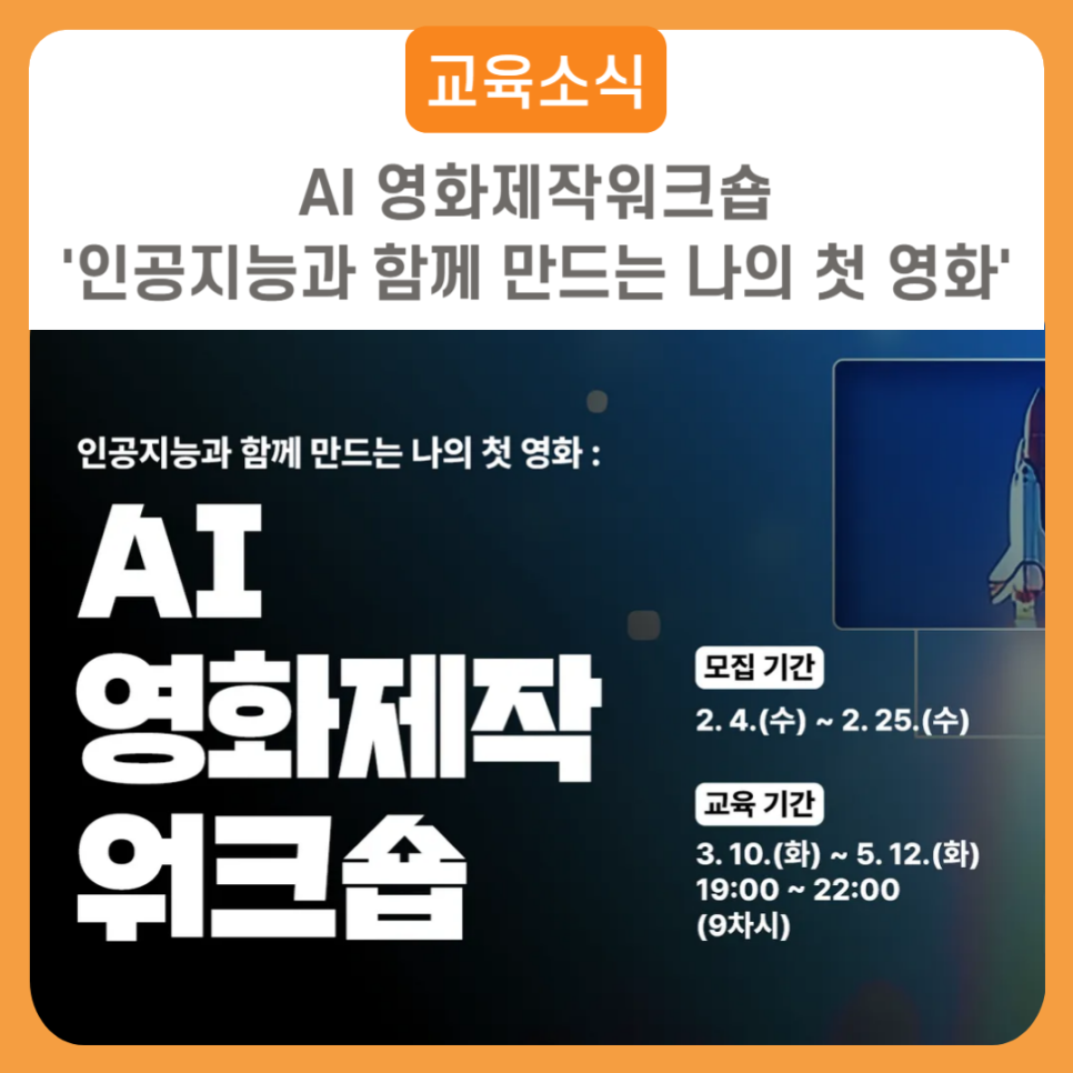 [교육소식] AI 영화제작워크숍 '인공지능과 함께 만드는 나의 첫 영화' 문의 : 중랑양원미디어센터(☎ 070-4155-0671) AI와 함께 만드는 나의 첫 영화~ 중랑양원미디어센터 AI 영화제작워크숍에서 도전해보세요! AI 영화 제작에 관심있거나 1인 영화 제작 제약을 넘어서고 싶은 중랑구민, 중랑구 학생 및 재직자라면 누구나 2월 25일(수) 13:00까지 구글폼을...