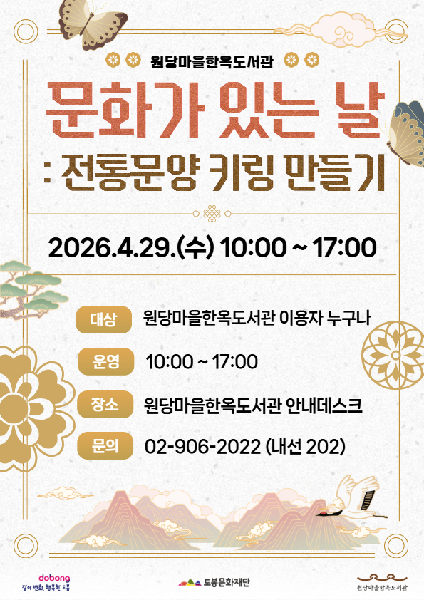 [2026년 4월 원당마을한옥도서관 문화가 있는 날 행사] < 전통문양 키링 공작소 > 2026년 4월 문화가 있는 날을 맞아 원당마을한옥도서관에서 '전통문양 키링 만들기'를 운영합니다~! 전통문양을 활용한 키링을 직접 만들어보며 우리 전통의 아름다움을 친숙하게 느껴보고, 일상에서 사용할 수 있는 소품을 완성하는 즐거운 시간을 마련하였습니다. 누구나 참여 가능한 체험으로, 도서관에서 전통문화를 쉽고 재미있게 만나보세요~! ~도서관 운영 중 행사 기간 내 상시 참여 가능한 프로그램 입니다~ 문의전화: 02-906-2022(내선 202) / 데스크 문의