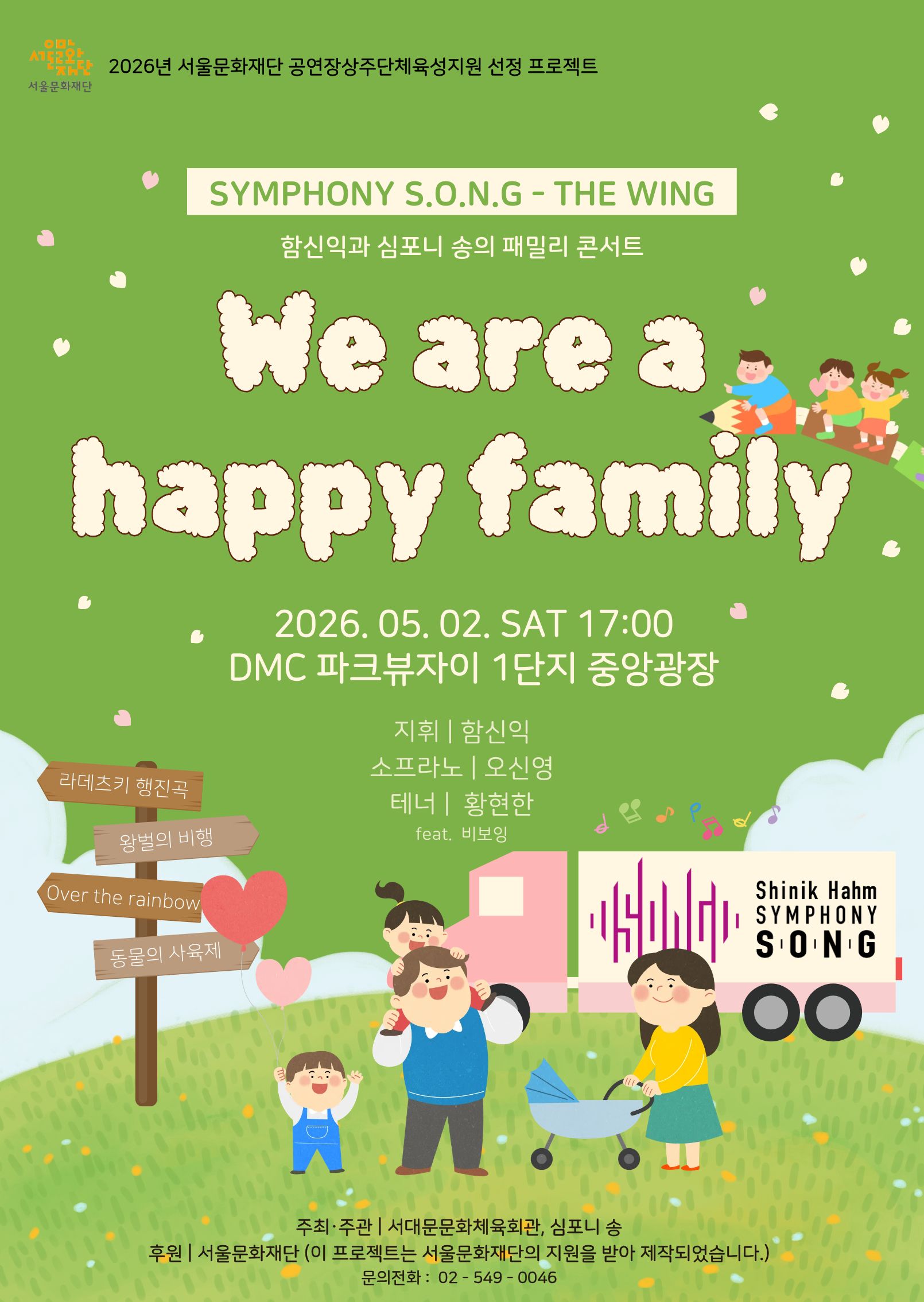 [2026년 서울문화재단 상주단체 육성지원사업] We are a happy family 콘서트 [행사개요] ▶일 시: 2026. 5. 2.(토) 17:00 ▶장 소: DMC파크뷰자이 1단지 중앙광장(서대문구 가재울미래로 2) ▶내 용: 이동개방식 무대(The Wing)를 활용한 야외 클래식 음악회 ▶출 연: 서대문오케스트라-함신익과 ...