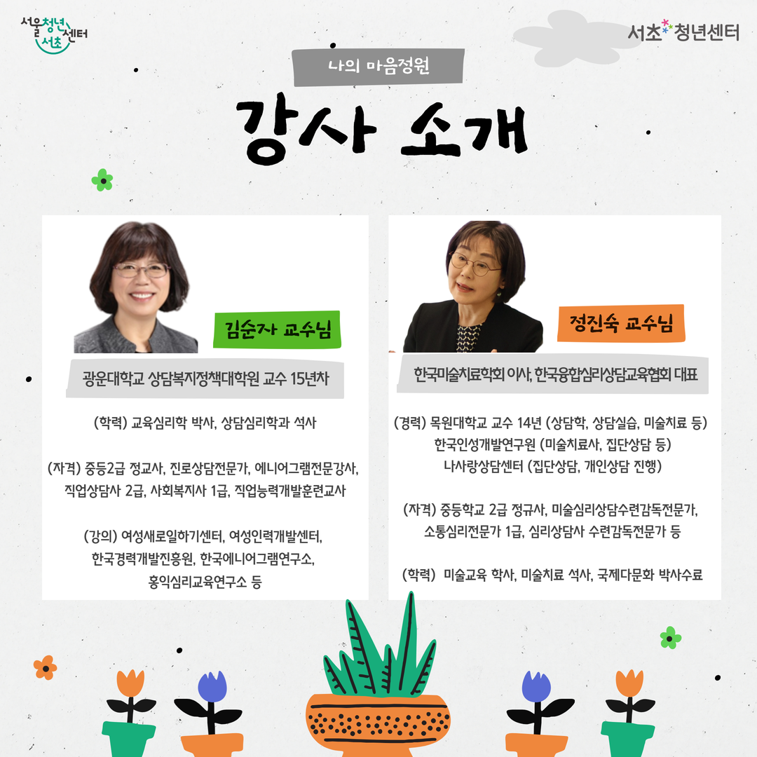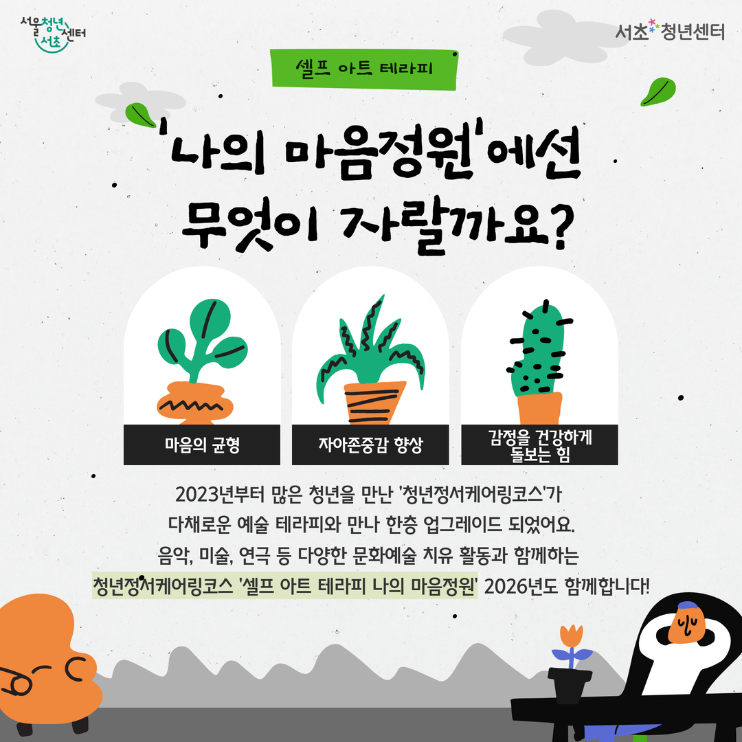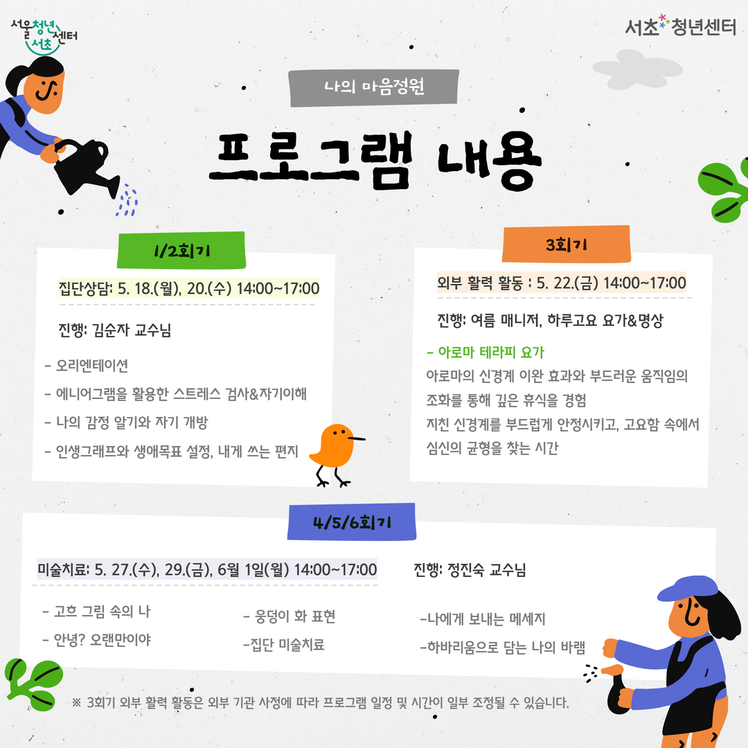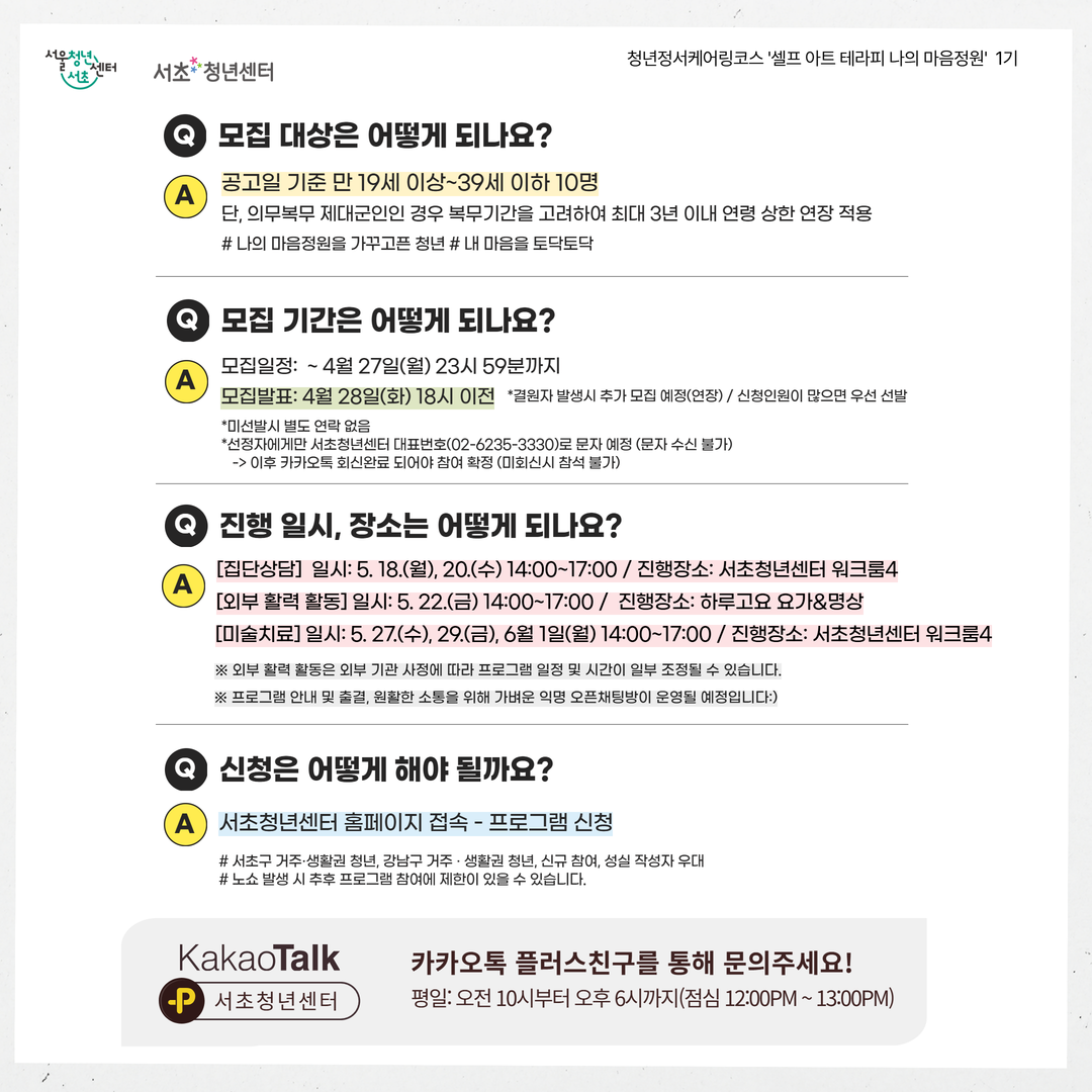 🌿 청년정서케어링코스 셀프 아트 테라피 <나의 마음정원> 1기 모집 집단상담과 예술테라피, 미술치료가 만나 지친 내 마음을 다정하게 돌보는 시간 💚 예술을 통해 나를 표현하고 이해하며 자아존중감과 정서적 안정을 높여보세요 :) 🌱 이런 변화를 경험할 수 있어요! ✔ 마음의 균형 ✔ 자아존중감 향상 ✔ 감정을 건강하게 돌보는 힘 🗓 프로그램 일정 (총 6회기 / 14:00~17:00) 1–2회기(집단상담) 5/18(월), 5/20(수) 3회기(외부활동 – 요가&명상) 5/22(금) 4–6회기(미술치료) 5/27(수), 5/29(금), 6/1(월) ※ 외부 기관 사정에 따라 일정 및 시간이 일부 조정될 수 있습니다. 👥 모집 대상 만 19세 ~ 39세 청년 10명 (※ 제대군인 최대 3년 연령 상한 연장) 📅 모집 일정 모집마감: ~ 4/27(월) 23:59 결과발표: 4/28(화) 18시 이전 ※ 선발자 개별 문자 안내 (미선발 별도 연락 없음) 📍 장소 서초청년센터 외부활동: 하루고요 요가&명상 💬 안내사항 원활한 소통을 위해 익명 오픈채팅방이 운영될 예정입니다. 프로그램 안내 및 참석 확인 등이 진행됩니다. ✏️ 신청 방법 서초청년센터 홈페이지 → 프로그램 신청 📩 문의 카카오톡 플러스친구 ‘서초청년센터’ #서초청년센터 #청년프로그램 #마음건강 #예술테라피 #미술치료 #청년상담 #자아존중감 #힐링프로그램 #청년정서케어링코스 #나의마음정원