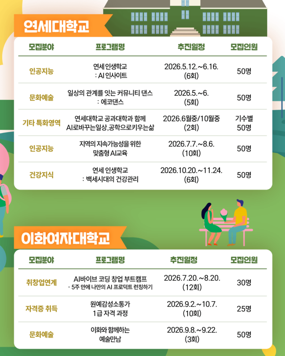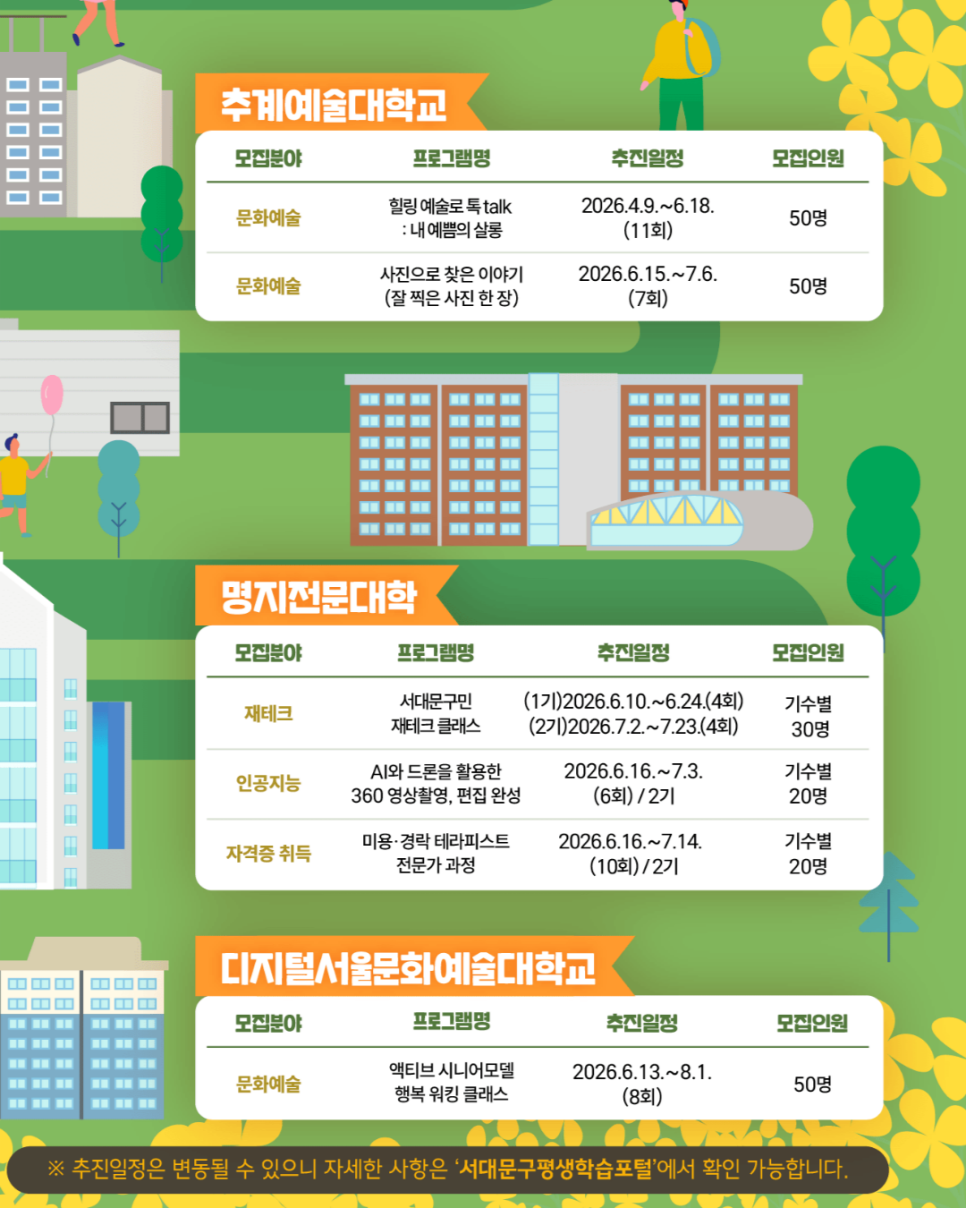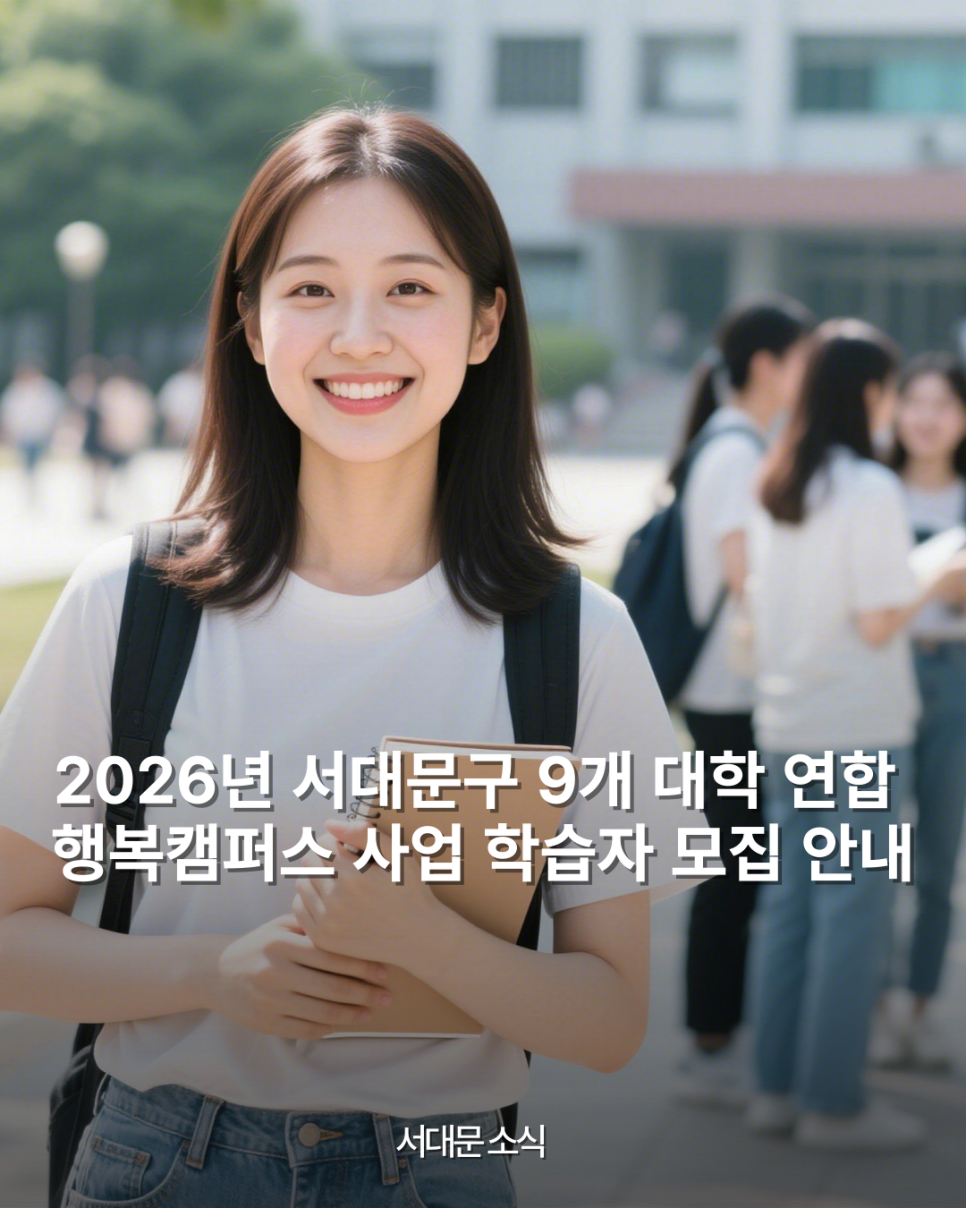 🎓 2026년 서대문구 9개 대학 연합행복캠퍼스 사업 학습자 모집 안내 2026년 서대문구 9개 대학 연합 행복캠퍼스 사업 학습자 모집 안내 배움에는 나이가 없습니다. 서대문구에서는 관내 대학과 함께 주민들에게 다양한 평생학습 기회를 제공하는 「행복캠퍼스 사업」 학습자를 모집합니다. AI, 문화예술, 건강, 자격증 과정 등 다양한 분야의 프로그램이 준비되어 있으니 관심...