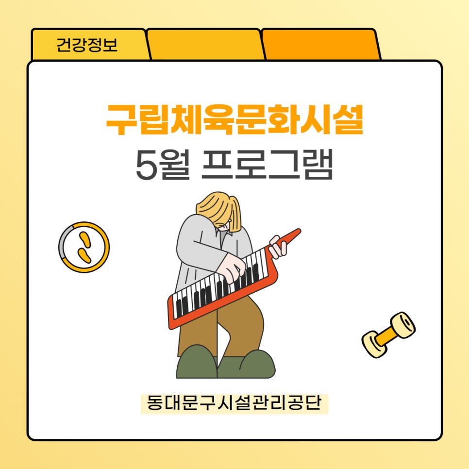 구립체육문화시설 5월 프로그램 운동부터 취미까지 한 번에 채우고 싶다면 지금 타이밍🏃 <동대문구립 체육문화시설>에서 원하는 수업 골라 들어요!🎹 구립체육문화시설 ✔ 개강일: 5. 2.(토) ✔ 대상 체육시설: 동대문구민체육센터, 이문체육문화센터, 동대문구체육관 ✔ 온라인 신청: 동대문구시설관리공단 누리집👉https://vo.la/LXOWpBJ ✔ 방문 신청 : 각 시...