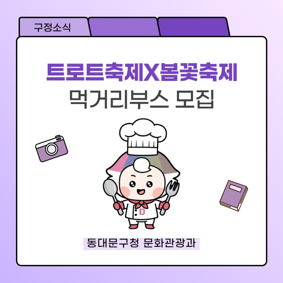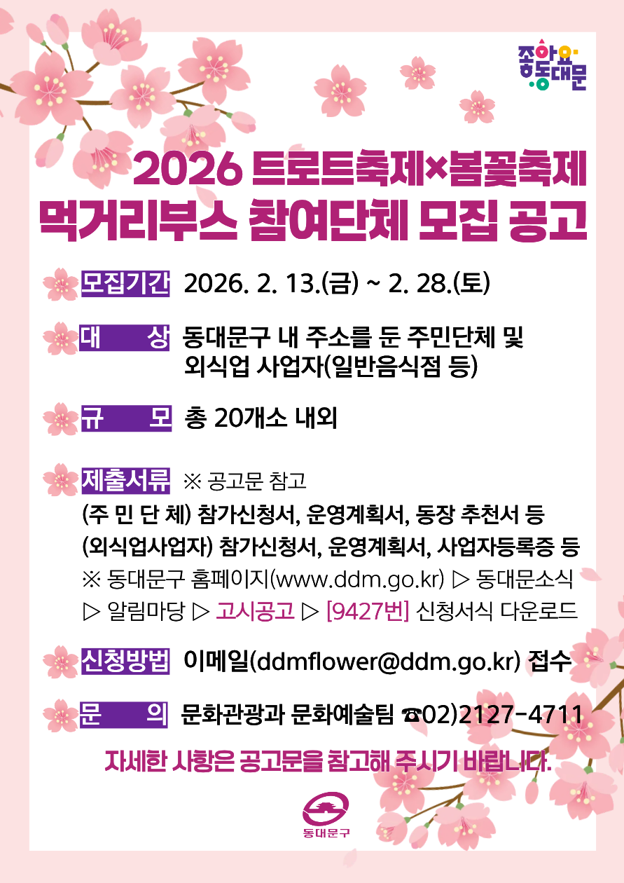 트로트축제×봄꽃축제 먹거리부스 모집 봄 되면 생각나는 동대문구 봄꽃축제, 올해는 트로트축제도 함께 찾아오는데요🧑🎤 4월의 신나는 축제 현장에서 맛있는 음식까지 즐길 수 있는 먹거리부스를 모집합니다!💃 행사개요 ✔ 진행기간: 2026. 4. 4.(토) ~ 4. 5.(일) / 2일간(예정) ✔ 진행장소 : 장안1 수변공원, 장안벚꽃길(군자교~이화교) 일대 ✔ 주요내용...
