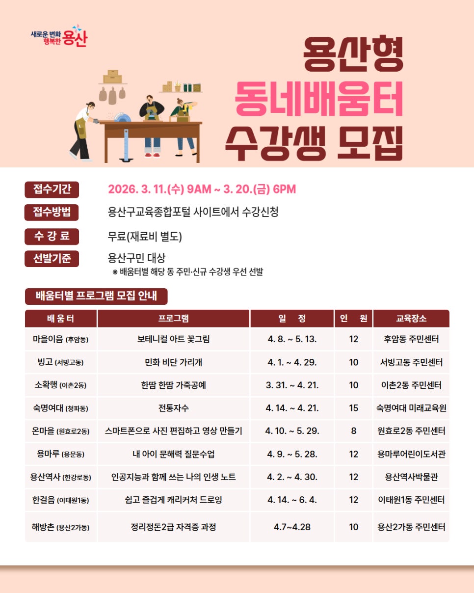 동네에서 만나는 배움의 기쁨☺️ 용산구 동네배움터에서 취미를 만들고 자기개발을 해보세요!🧵 🧵접수기간🧵 2026. 3. 11.(수) 09:00 ~ 3. 20.(금) 18:00 까지 🧵접수방법🧵 인터넷 접수(용산구교육종합포털) 🔗용산구교육종합포털 > 수강신청 > 용산형 동네배움터 수강신청 https://vo.la/0K4E0z4 수강신청 > 수강신청 > 용산구교육종합포털 분야...