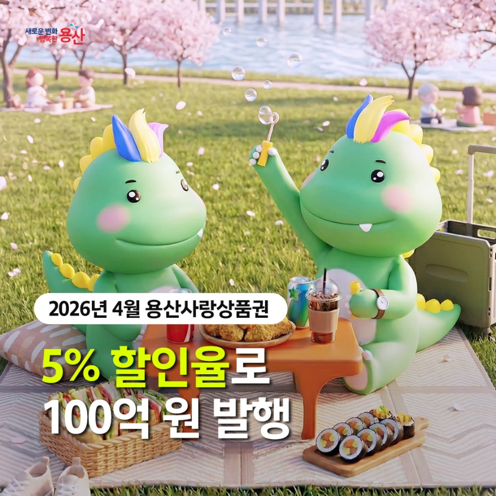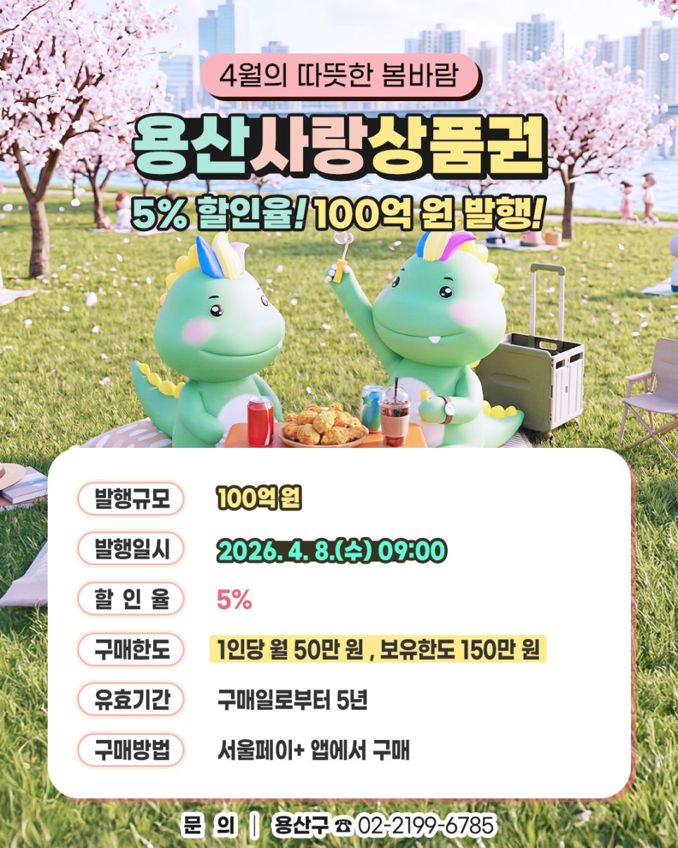 [🌸 4/8 오전 9시! 용산사랑상품권 100억 발행] 4월의 봄바람 타고 찾아온 혜택! 💸 따뜻한 봄날, 용산에서 5% 할인받고 즐기세요. ✨ 🔶 발행일 : 2026. 4. 8.(수) 09:00 🔶 구매처 : 서울페이+ 앱 🔶 혜택 : 5% 즉시 할인 구매 🔶 한도 : 월 50만 원 구매 가능 (보유 150만 원) 🔶 유효기간 : 구매일로부터 무려 5년! ⚠️ 100억...