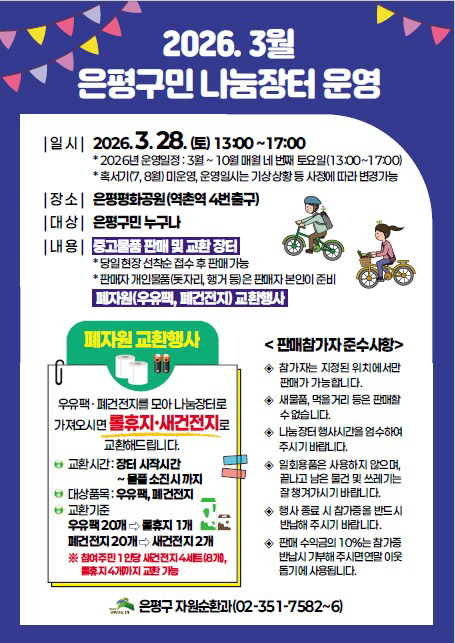 은평구민 3월 나눔장터 운영 안내 ♻️ 중고물품을 교환하고 판매할 수 있는 은평구민 나눔장터 가 열립니다. 사용하지 않는 물건을 나누며 자원 재활용과 환경 보호 를 함께 실천해 보세요. 지역 주민 누구나 참여 가능하니 많은 관심과 참여 바랍니다! 📌 운영 일정 2026. 03. 28.(토) 13:00 ~ 17:00 📌 장소 은평평화공원 (역촌역 4번 출구) 📌 참여 대상 지역 주민 누구나 📌 주요 내용 1️⃣ 재사용 물품 교환·판매 장터 - 당일 현장 선착순 접수 (12:00 ~ 13:00) 후 자율 판매 - 판매자 개인 물품(행거, 돗자리 등)은 개별 준비 - 새제품 및 먹거리 판매, 상업적 거래행위, 1회용품 사용 금지 2️⃣ 폐자원 교환 행사 운영시간 : 13:00 ~ 물품 소진 시까지 [교환 기준] 우유팩 20개 → 롤휴지 1개 폐건전지 20개 → 새 건전지 2개 3️⃣ 재활용 정책 홍보 캠페인 - 올바른 재활용품 분리배출 안내 - 폐비닐 및 폐건전지 분리배출 안내 📞 문의 은평구청 자원순환과 자원재활용팀 ☎ 02-351-7584