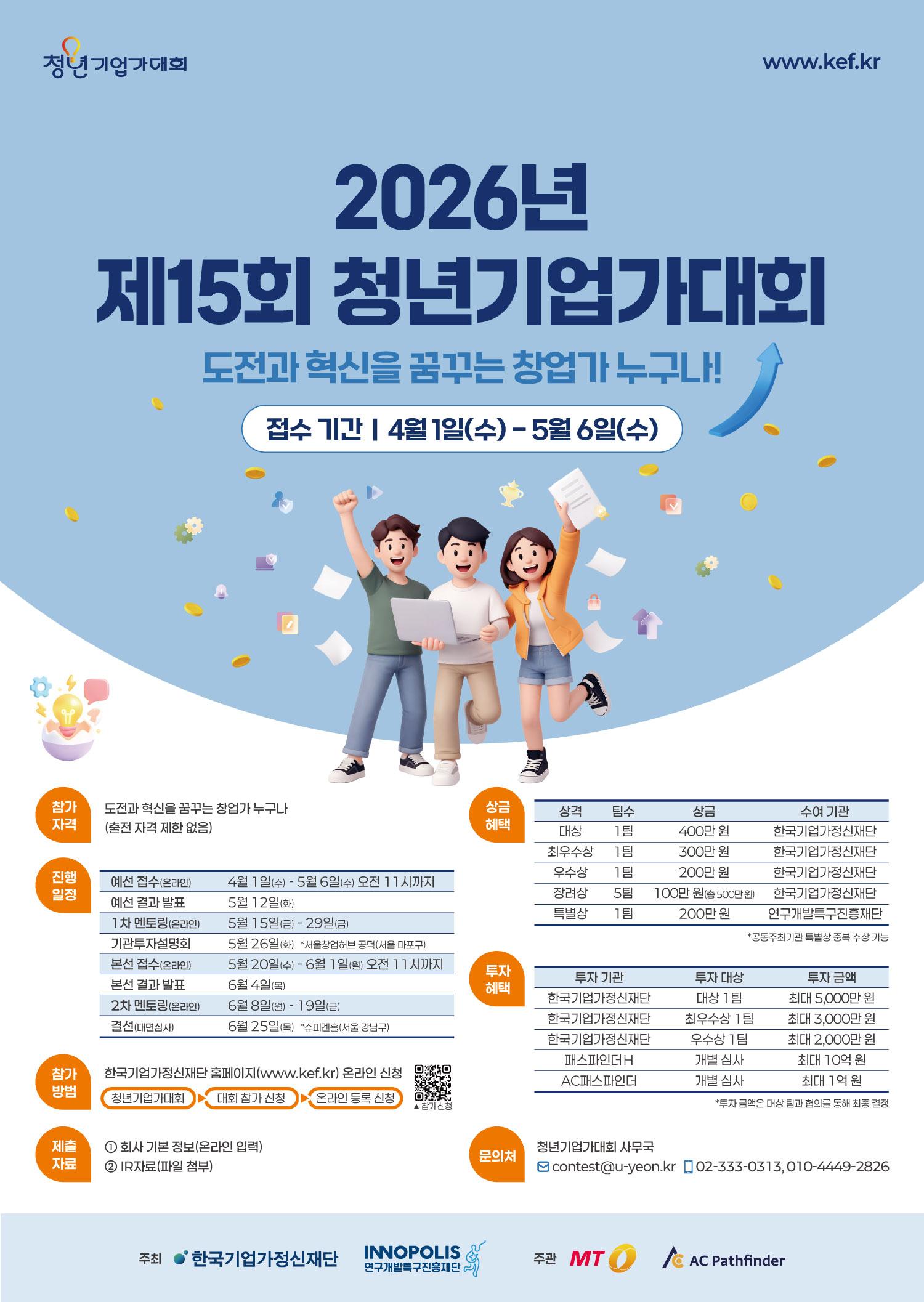 <2026년 제15회 청년기업가대회>가 도전과 혁신을 꿈꾸는 창업가를 찾습니다! 2011년부터 한국기업가정신재단과 머니투데이가 주최해 온 본 대회는 미래 한국 경제를 이끌 유망 스타트업을 발굴하고 지원해 왔습니다. 그동안 크몽, 스타일쉐어, VCNC(타다 운영사), 엔도로보틱스 등 기업 가치가 수천억 원에 달하는 예비 유니콘들을 배출하며 국내 최고의 창업 경진대회로 자리매김했습니다. 올해 역시 총 1억 1,600만 원 규모의 상금과 투자금이 준비되어 있으며, 선발된 팀에게는 멘토링,네트워킹,후속 투자 기회 등 실질적인 성장의 발판을 제공합니다. 본 게시물에 첨부된 포스터 및 모집 공고문 파일을 확인하시어 많은 관심과 참여 부탁드립니다. 대한민국을 이끌 청년 창업가의 도전을 기다립니다! 관련기사 : https://www.mt.co.kr/future/2026/04/01/2026033110464272229 신청방법 및 대상 ■ 신청 기간 : 2026년 4월 1일(수) – 2025년 5월 6일(수) 오전 11시까지 ■ 신청 대상 : 도전과 혁신을 꿈꾸는 창업가 누구나(출전자격 제한 없음) ■ 신청 방법 : 한국기업가정신재단 홈페이지 https://www.kef.kr/contest/entry 온라인 신청 (청년기업가대회→대회 참가 신청→온라인 등록 신청) 제출 서류 ■ 회사 기본 정보(온라인 입력) ■ IR 자료(파일 첨부) 선정절차 ■ 예선 접수(온라인) : 4월 1일(수) - 5월 6일(수) 오전 11시까지 ■ 예선 결과 발표 : 5월 12일(화) ■ 1차 멘토링(온라인) : 5월 15일(금) - 5월 29일(금) ■ 기관투자설명회 : 5월 26일(화) *서울창업허브 공덕(서울 마포구) ■ 본선 접수(온라인) : 5월 20일(수) - 6월 1일(월) 오전 11시까지 ■ 본선 결과 발표 : 6월 4일(목) ■ 2차 멘토링(온라인) : 6월 8일(월) - 6월 19일(금) ■ 결선(대면) : 6월 25일(목) *슈피겐홀(서울 강남구) 지원 내용 ■ 상금혜택 대상(1팀) 한국기업가정신재단 400만원 수여 최우수상(1팀) 한국기업가정신재단 300만원 수여 우수상(1팀) 한국기업가정신재단 200만원 수여 장려상(5팀) 한국기업가정신재단 100만원(총 500만원) 수여 특별상(1팀) 연구개발특구진흥재단 200만원 수여 ■ 투자혜택 대상(1팀) 한국기업가정신재단 최대 5,000만원 투자 기회 최우수상(1팀) 한국기업가정신재단 최대 3,000만원 투자 기회 우수상(1팀) 한국기업가정신재단 최대 2,000만원 투자 기회 패스파인더H 개별 심사 후 최대 10억원 투자 AC패스파인더 개별 심사 후 최대 1억원 투자 *투자 금액은 대상 팀과 협의를 통해 최종 결정 *대회 수상 결과와 상관없이, 공동주최기관인 패스파인더H와 AC패스파인더는 개별 심사를 통해 각각 최대 10억원과 1억원의 투자 가능 ■ 지원혜택 - 본선진출팀, 결선진출팀 대상 VC/AC 멘토링 진행 - 미디어 홍보 지원, 공동투자 연결, 시너지업체 연결, 후속투자 연계 등 초기 스타트업 성장에 필요한 다양한 지원 제공 문의처 ■ 청년기업가대회 사무국 contest@u-yeon.kr 02-333-0313, 010-4449-2826