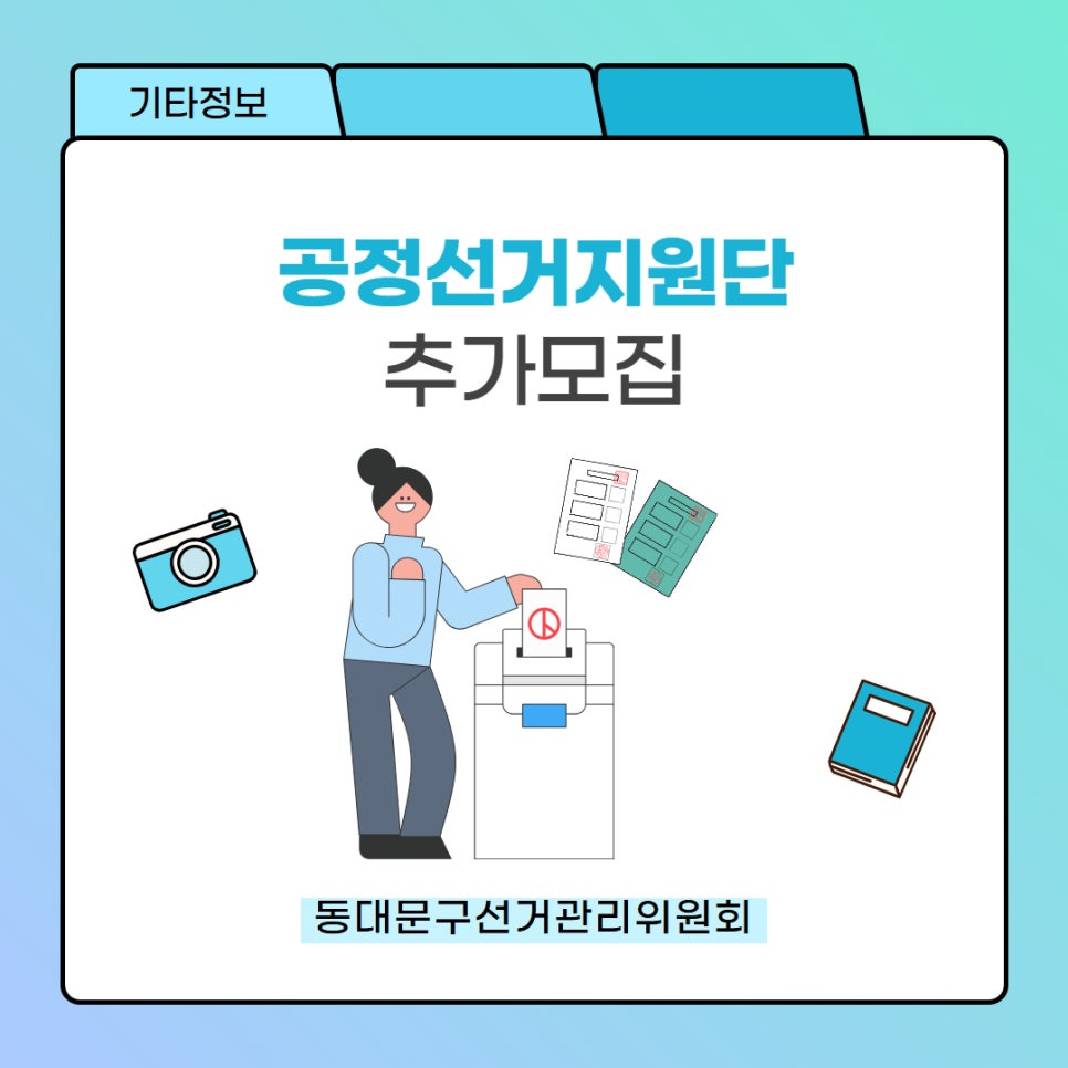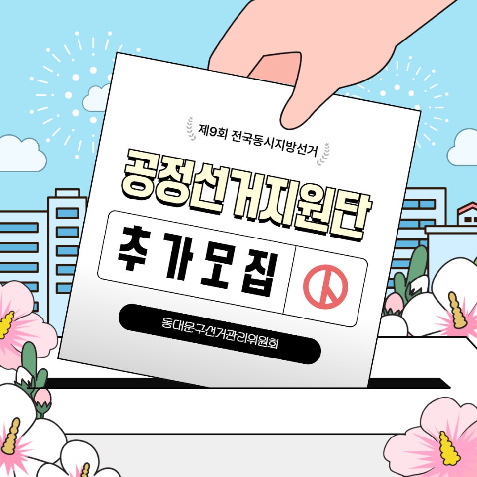 공정선거지원단(선거지원단) 추가 모집 공정한 선거를 함께 만들어가고 싶다면 지금 참여해보세요🗳️ 선거 현장 지원부터 단속 보조까지 지원해 줄 <공정선거지원단>을 추가 모집합니다! ☑️ 채용분야 제9회 전국동시지방선거 공정선거지원단(선거지원단) ☑️ 지원자격 「공직선거법」 제60조의 ‘선거운동을 할 수 없는 자’에 해당되지 않는 사람으로서 정당의 당원이 아닌 중립적이...