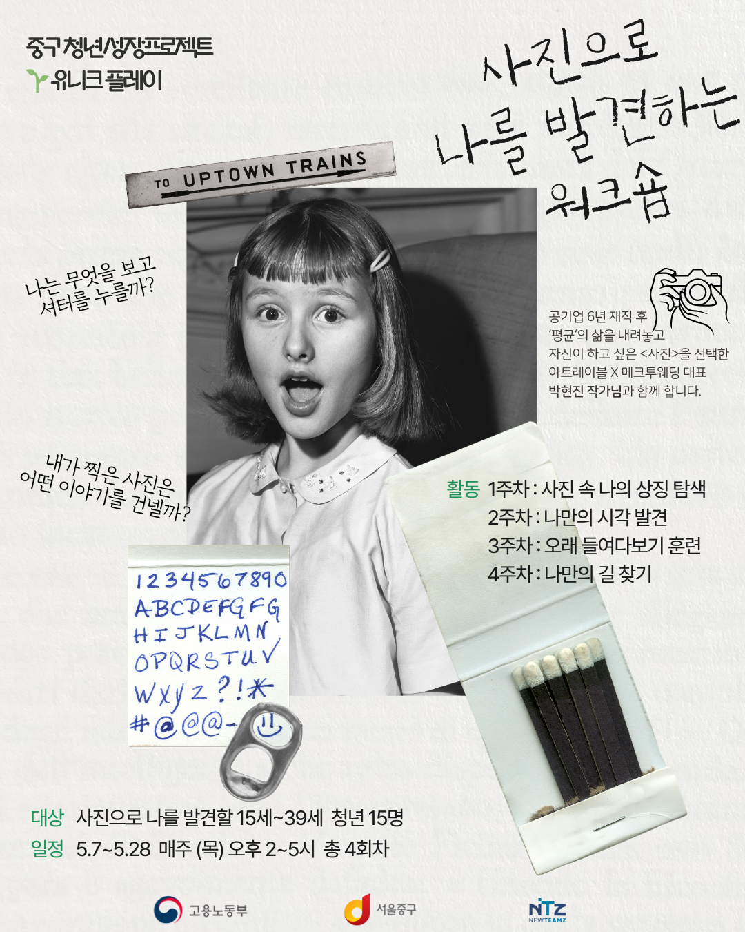 <사진으로 나를 발견하는 워크숍> 📸 사진을 잘 찍는 시간이 아니라, 내가 무엇에 반응하는 사람인지 알아보는 시간. 무심코 셔터를 누른 순간들 속에는 이미 ‘나’에 대한 단서가 담겨 있습니다. 어떤 장면에 멈췄는지, 왜 그걸 찍고 싶었는지, 그 선택들을 따라가다 보면 생각보다 선명한 나를 만나게 됩니다. 정답을 찾기보다 나를 이해하는 감각을 키우는 시간. 그리고 그 과정에서 ‘내가 어떤 방향으로 살아가고 싶은지’에 대한 작은 힌트를 발견하게 될 거예요. 🌱 이런 분들에게 추천해요 ✔ 내가 뭘 좋아하는지 아직 잘 모르겠는 분 ✔ 진로 고민이 있지만, 생각만 맴돌고 있는 분 ✔ 나를 객관적으로 바라보는 경험이 필요한 분 ✔ 평소 사진은 찍지만, 의미까지는 생각해본 적 없는 분 ✔ ‘나답게 일한다는 것’이 무엇인지 고민해보고 싶은 분 📷 진행 과정 (총 4회) 1회차. 나를 상징하는 장면을 찍고, 그 의미를 풀어보기(5월 7일, 목) 2회차. 일상 속에서 반복되는 ‘나의 시선’ 발견하기(5월 14일, 목) 3회차. 하나의 대상에 깊이 몰입하며 관찰하는 훈련하기(5월 21일, 목) 4회차. 작가님의 실제 커리어 여정에서 영감을 얻어 나의 길 찾기(5월 28일, 목) 👥 정원 15명 📆 일정 2026년 5월 7일(목) ~ 5월 28일(목), 14:00 ~ 17:00, 총 4회차 ※ 매주 목요일 운영 📍 장소 을지유니크팩토리 (서울 중구 을지로 170, 을지로4가역 10번 출구 B2) 📝 신청 기간 ~2026년 4월 30일(목)까지 (신청자 많을 시 조기 마감될 수 있습니다.) 📌 참여 안내 프로그램 시작 D-7 📌 신청 방법 ☑️ 프로필 링크 ❤️ 문의 https://pf.kakao.com/_ytIPn/ 🚨신청 후 '노쇼'하는 경우, 이후 프로그램 참여가 제한될 수 있습니다. 🚨이 프로그램은 2026 중구 청년성장프로젝트의 일환으로 고용노동부, 서울시 중구의 지원으로 진행됩니다. #사진워크숍 #사진작가 #청년성장프로젝트 #을지유니크팩토리 #경험지원 #일상지원 #청년 #취준생 #청년프로그램